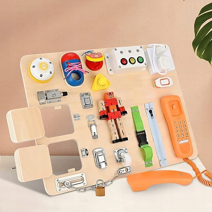- 【Дошка для занять 20 в 1】 Наші навчальні іграшки мають 20 центрів активності, включаючи засувки, пряжку, металеві пряжки, двері, дзвіночки, взуття, роботів, колеса, вимикачі, розетки, телефони та замки з ключами.
