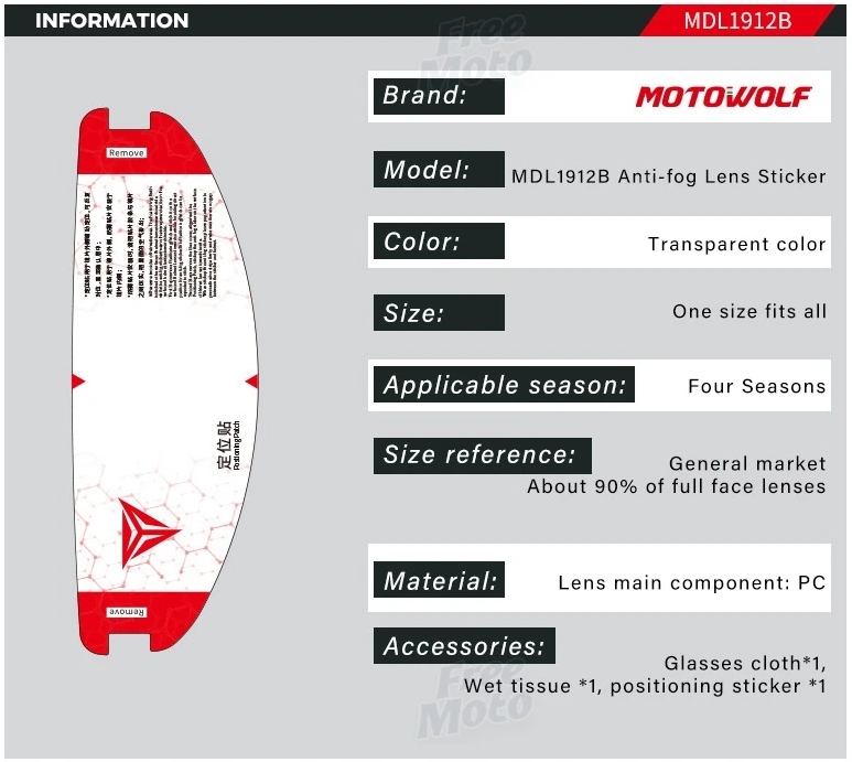 Master of Anti-Fog від MotoWolf — це вдосконалена плівка TAC, яка за будь-яких умов (вологість, висока температура, сильний дощ) гарантує кришталево чисту прозорість без запотівання протягом понад 3 років. Гідрофобне покриття відштовхує краплі води, а тонкий сірий відтінок покращує контрастність, роблячи світлофори чіткішими. Універсальний розмір – підходить для ~90% стандартних повнолицевих козирків шоломів.