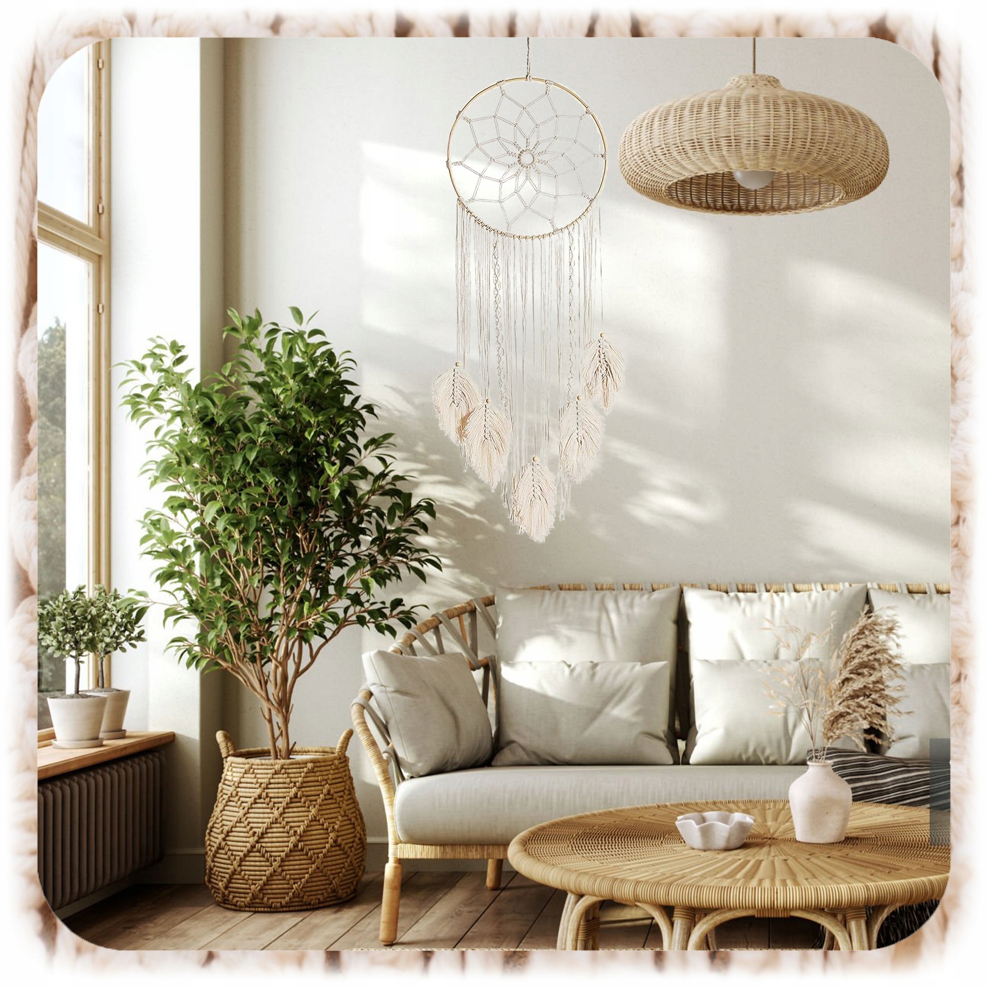 Підвішений у спальні або над дитячим ліжком, він функціонує як сучасний ловець снів, створюючи атмосферу відпочинку та безпеки.