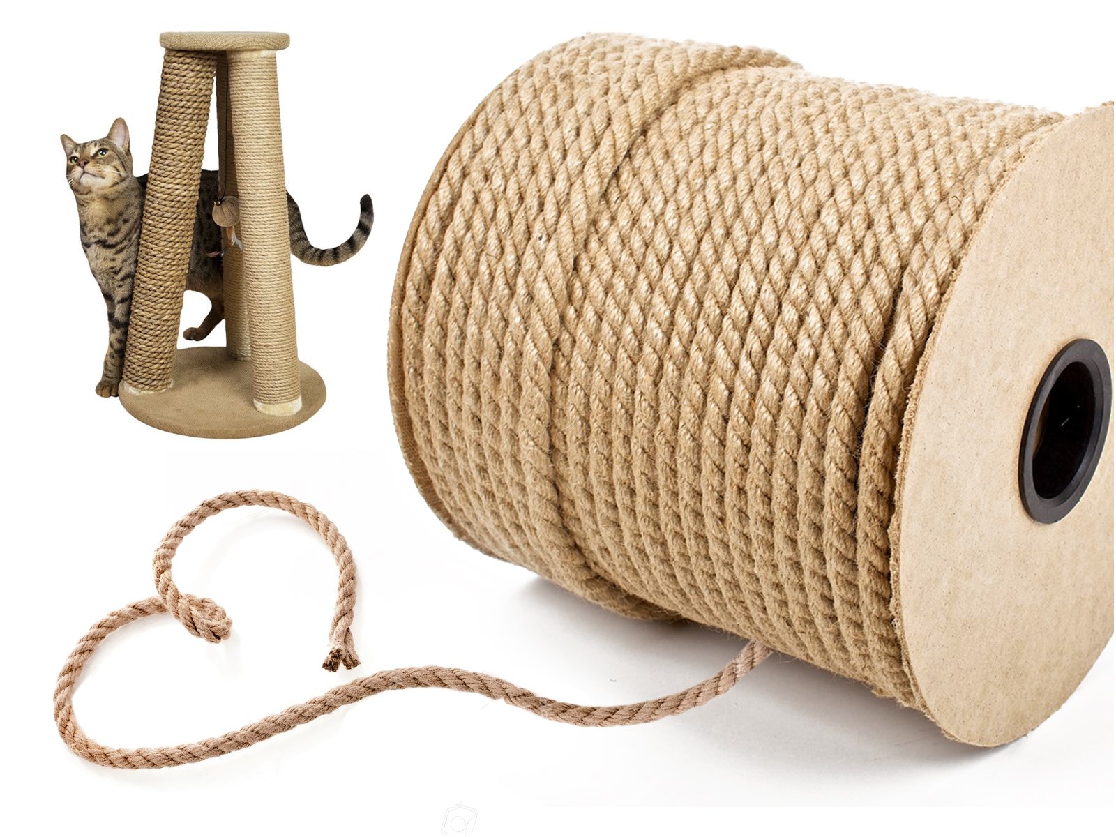 Товста джутова нитка. Він дуже жорсткий і стійкий до навантажень. Ідеально підходить для дряпання стовпів - також для перев'язування використаних стовпів, але також може використовуватися в декоративних цілях, а також у сільському господарстві та будівництві.