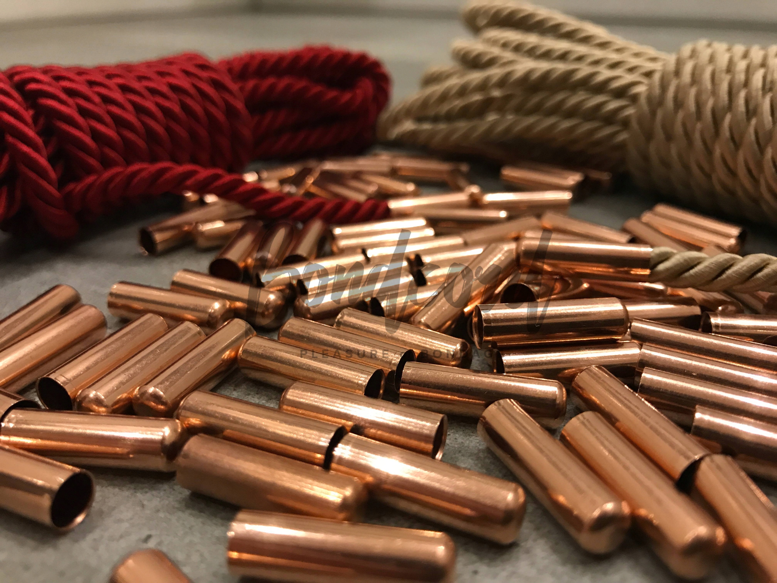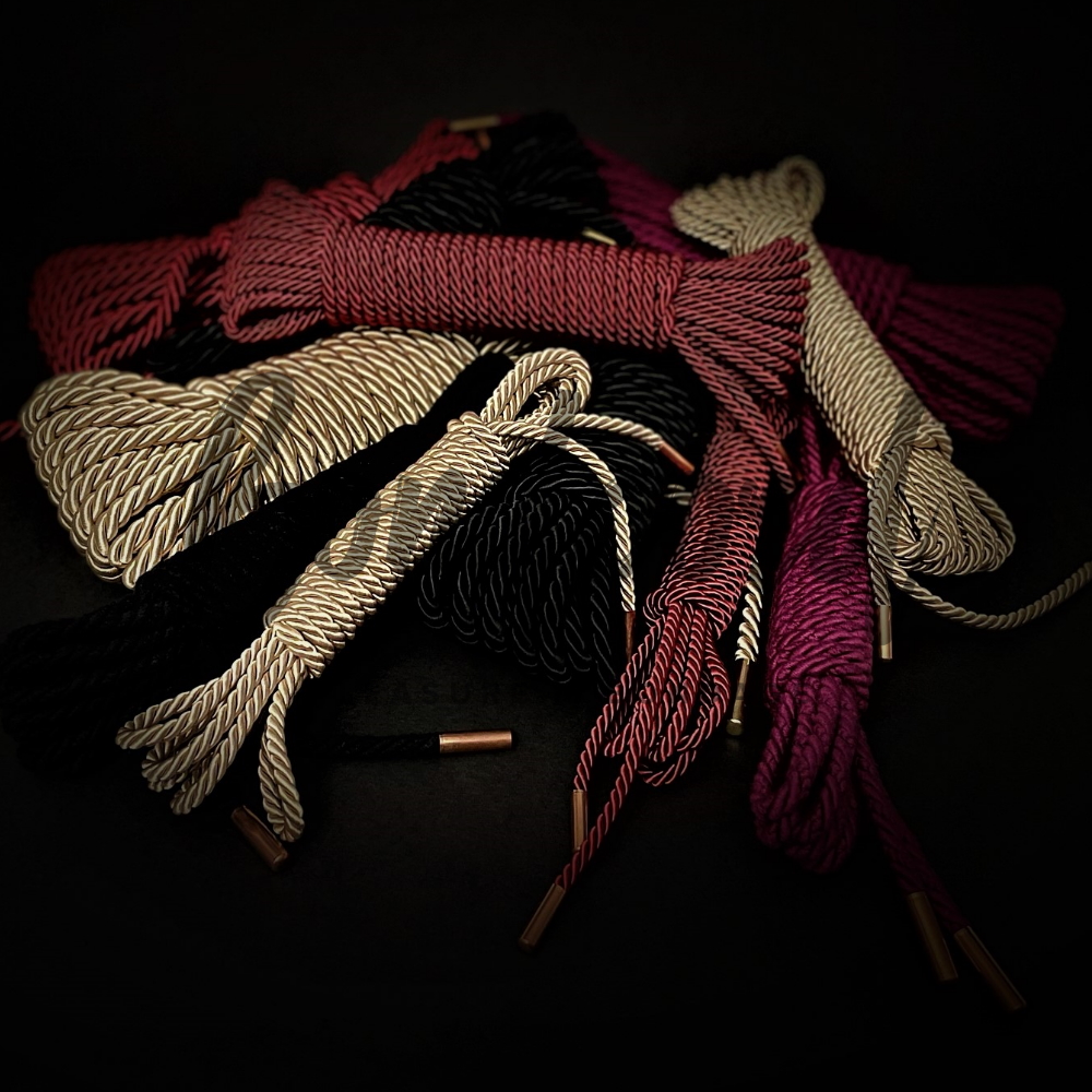 Естетика. Досягаючи діапазону кольорів, ми шукали відтінки, які б найкраще підкреслювали красу переплетень і зв’язків. Серед іншого наш вибір припав на червоний, золотий і позачасовий чорний, які давно вважаються найбільш стимулюючими та чуттєвими кольорами. І оскільки ми хотіли створити продукт найвищої якості, ми подбали про найдрібніші деталі. Ось чому кінці наших мотузок закріплені мідними наконечниками.