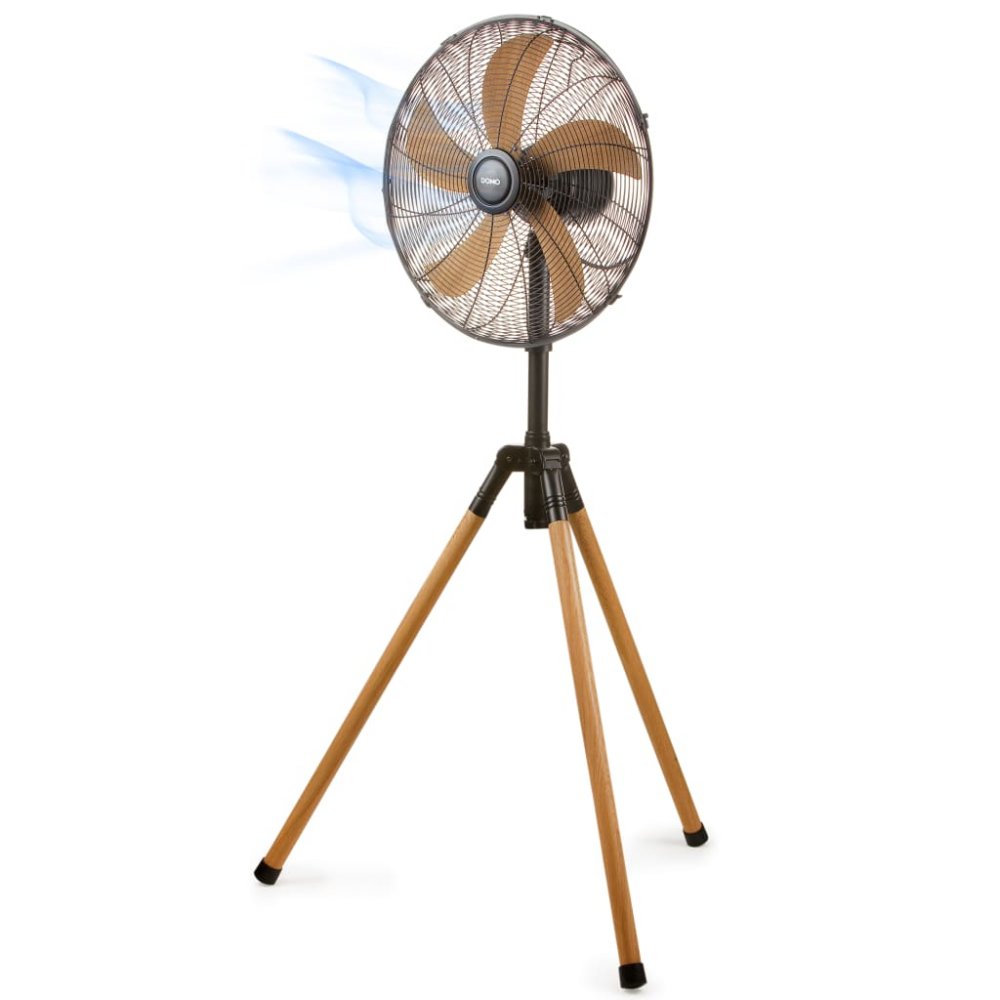 Стоячий вентилятор, імітація дерева, Діаметр пропелера: 45 см, 3 швидкості, Можливість автоматичного коливання (обертання вбік), регульована висота та кут обдування, Мінімальна та максимальна висота: 130-150 см, Довжина шнура живлення: 1 , 55 м, Споживана потужність: 50 Вт