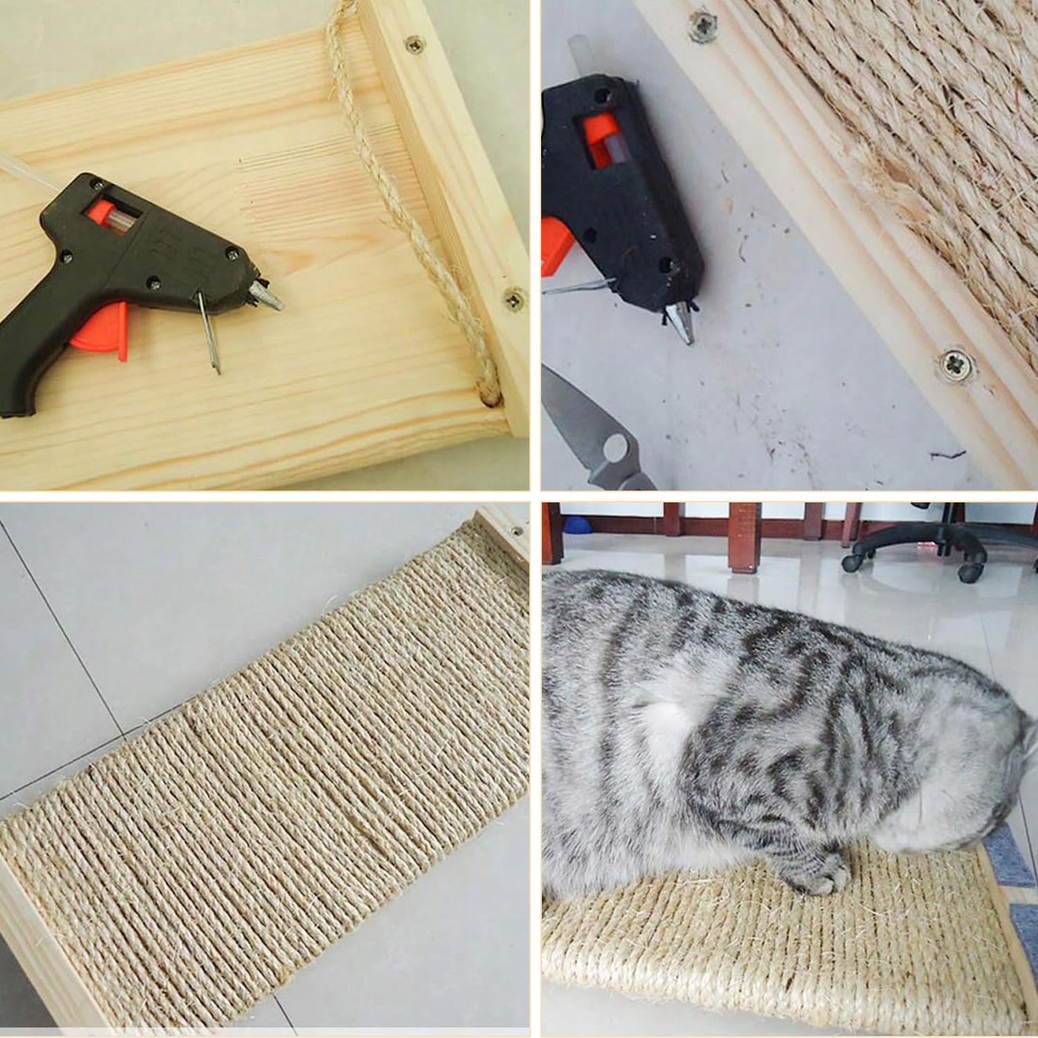 🐈 Простий у використанні, вам потрібен лише пістолет для гарячого клею. Прикріпіть джутову мотузку пістолетом для гарячого клею, потім рівномірно оберніть його навколо предметів, які ви хочете зробити, і, нарешті, прикріпіть її за допомогою пістолета для гарячого клею, щоб створити нову конструкцію для лазіння для вашого кота.