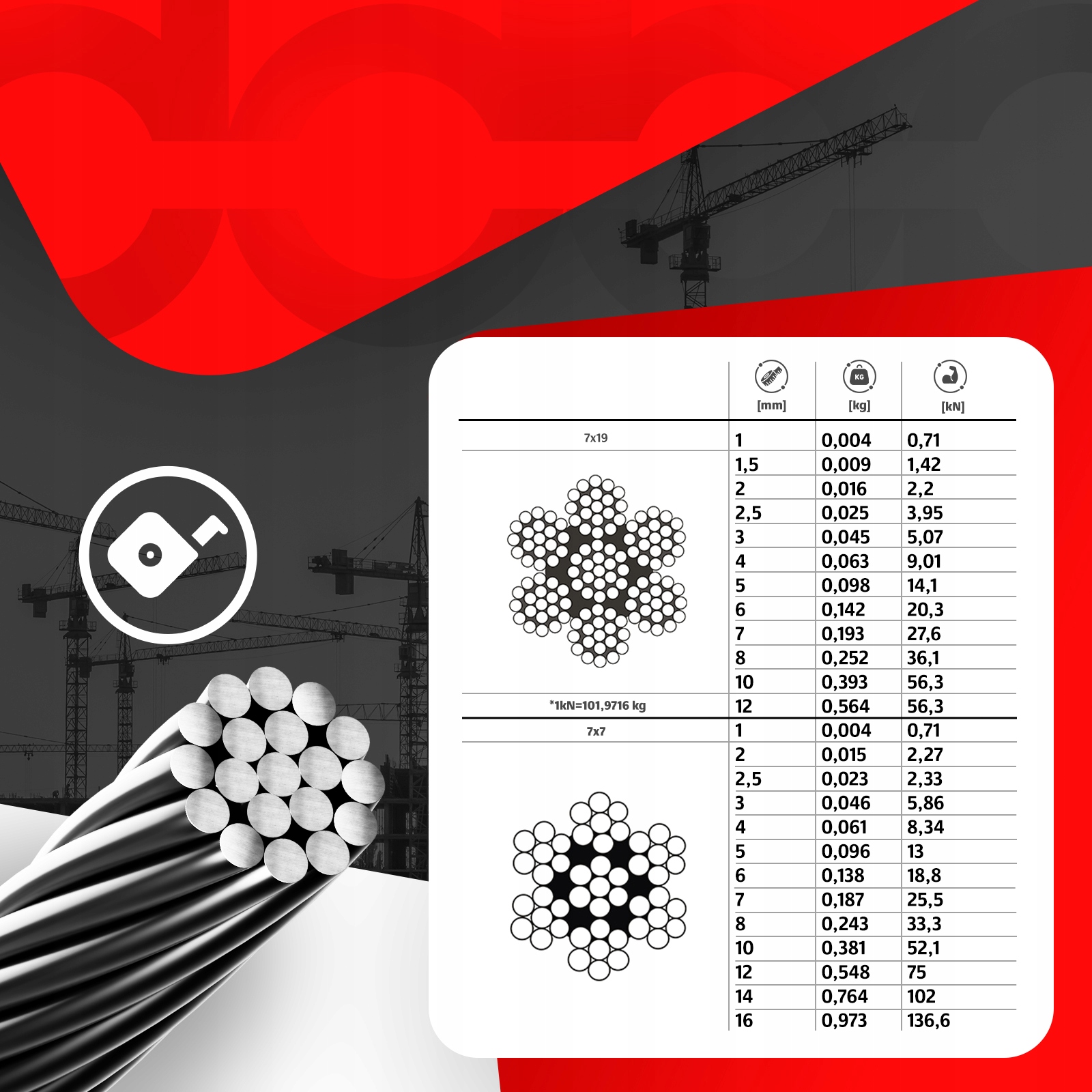 Конструкція мотузки: семижильна, тобто кожна нитка містить дев'ятнадцять дротів однакового діаметру, у трьох шарах (1+6+12).