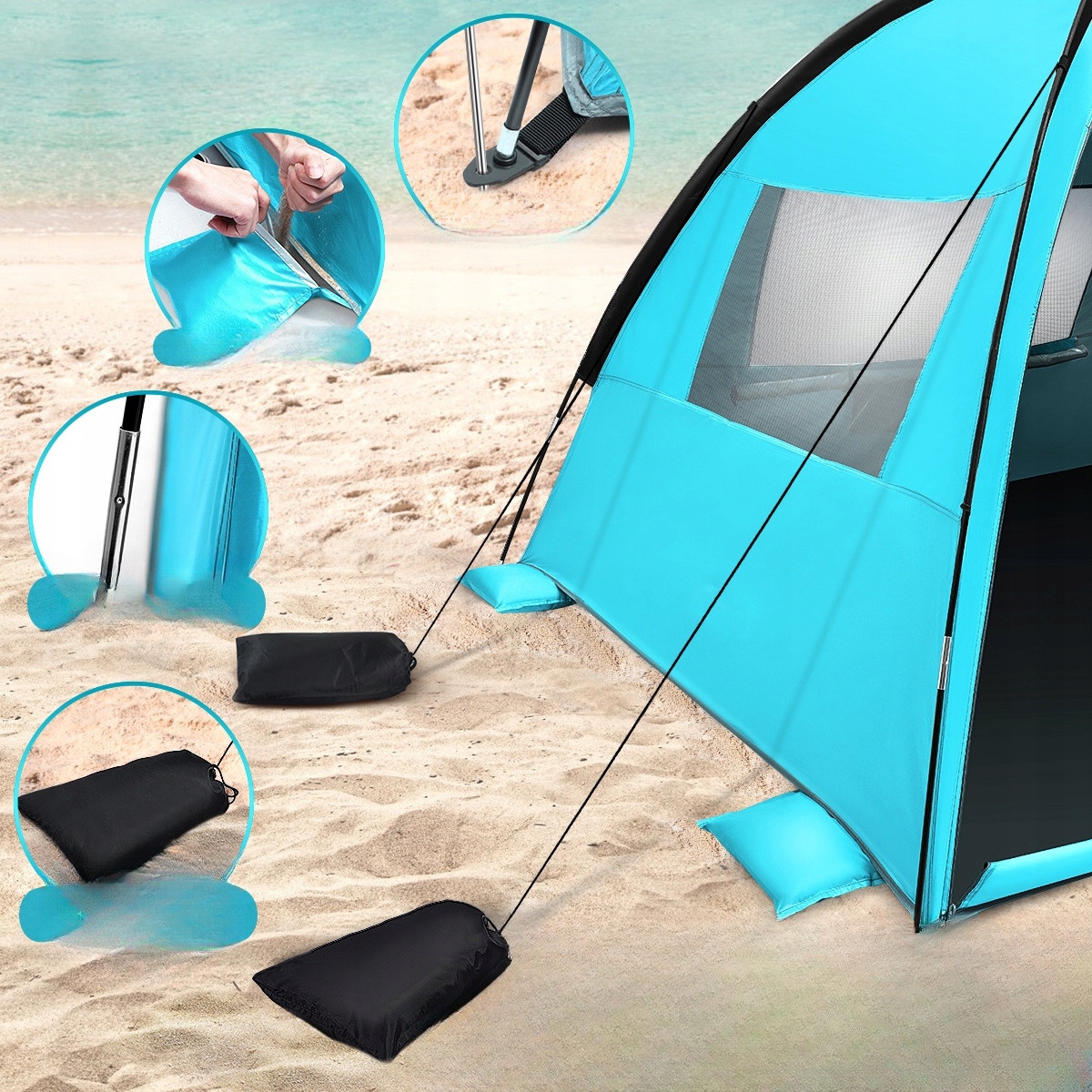 ✅Мішки з піском у 4 кутах, щоб тримати намет стабільним. Додаткові мотузки для кріплення, опори та мішки з піском для захисту намету від сильного вітру.