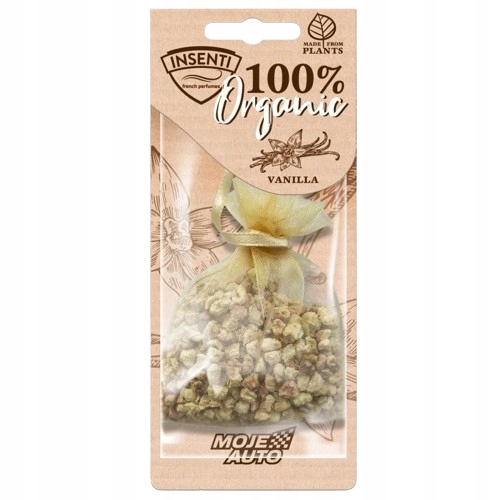 MY CAR INSENTI ORGANIC - це натуральний органічний освіжувач повітря, який використовує гранули рослинного походження просочені натуральними ароматичними оліями. Гранули стійкі до високих температур і поступово виділяють приємний ванільний аромат до 45 днів, забезпечуючи тривалу свіжість в автомобілі, домі чи офісі.