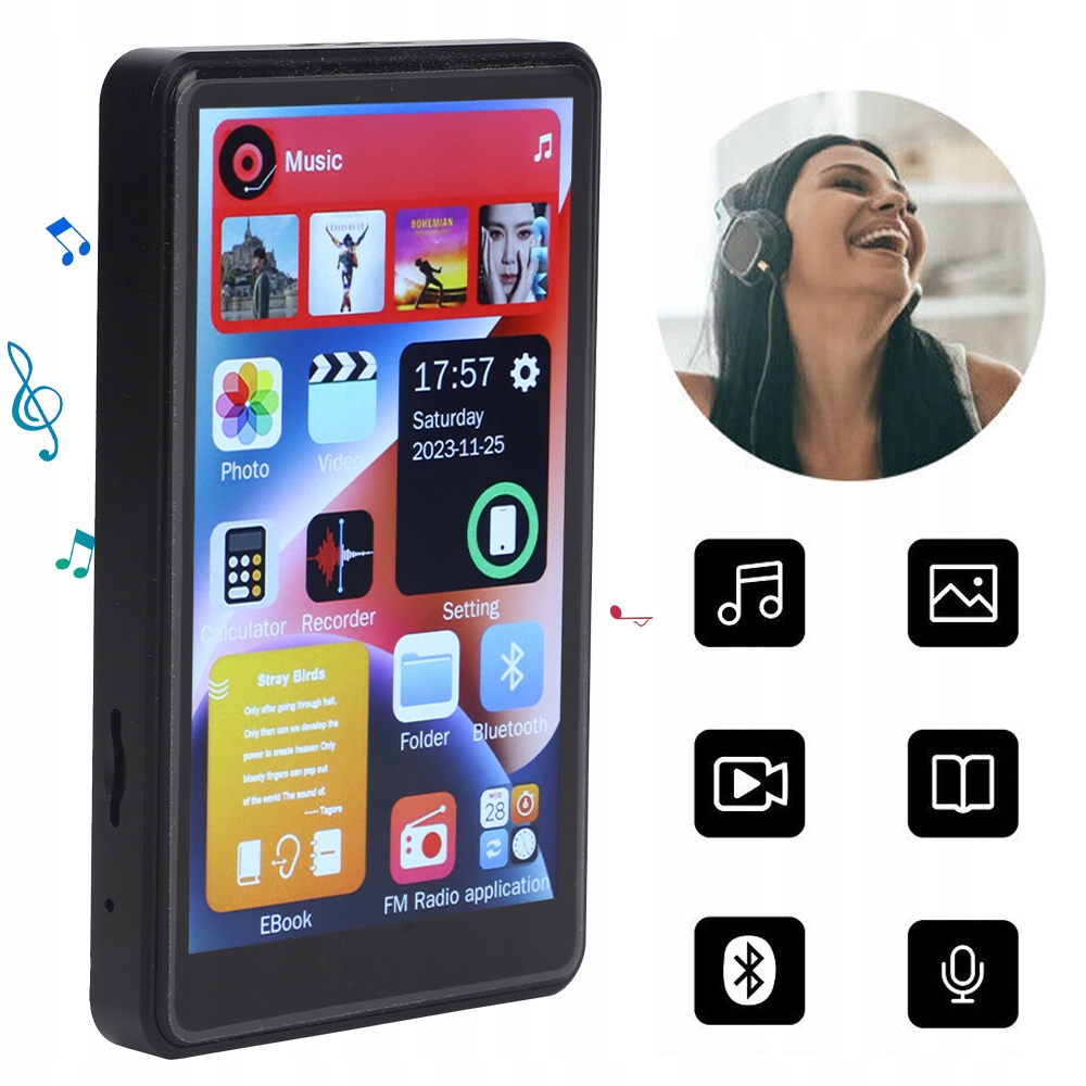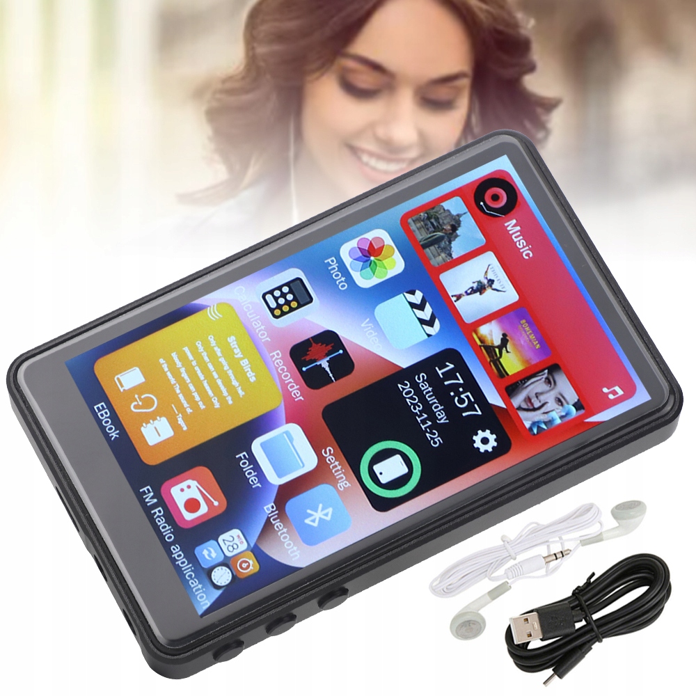 MP3 MP4-плеєр із внутрішньою пам’яттю 16 ГБ пропонує унікальний мультимедійний досвід. Оснащений сенсорним екраном, він забезпечує інтуїтивно зрозуміле керування, дозволяючи плавно перемикатися між улюбленими піснями та регулювати гучність. Його можна брати з собою буквально скрізь - у подорож, на тренування чи на прогулянку.
