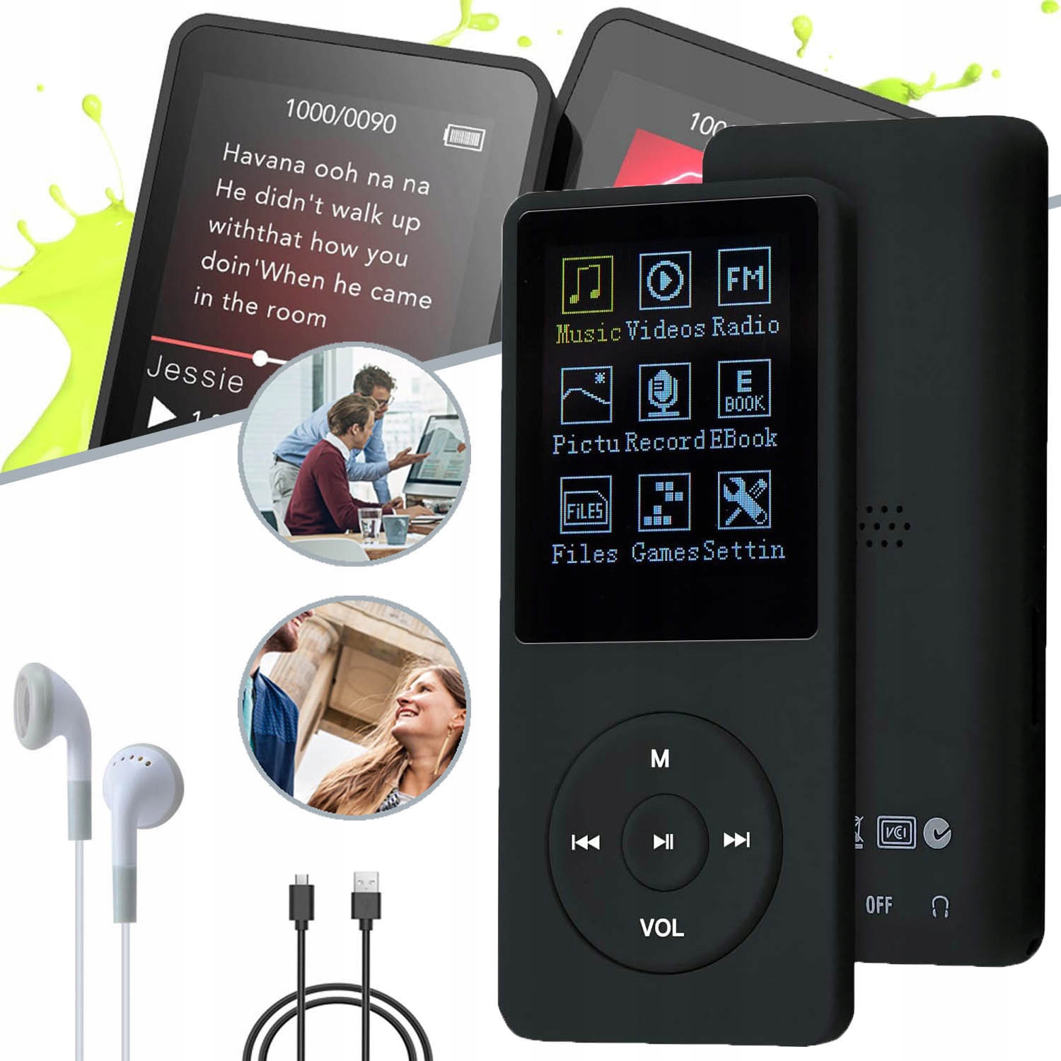 - Додаткові функції: FM-радіо, папка, Bluetooth, запис, налаштування, відео, календар, крокомір, електронна книга, фото, тимчасова заставка, повтор A-B, відтворення зі змінною швидкістю.