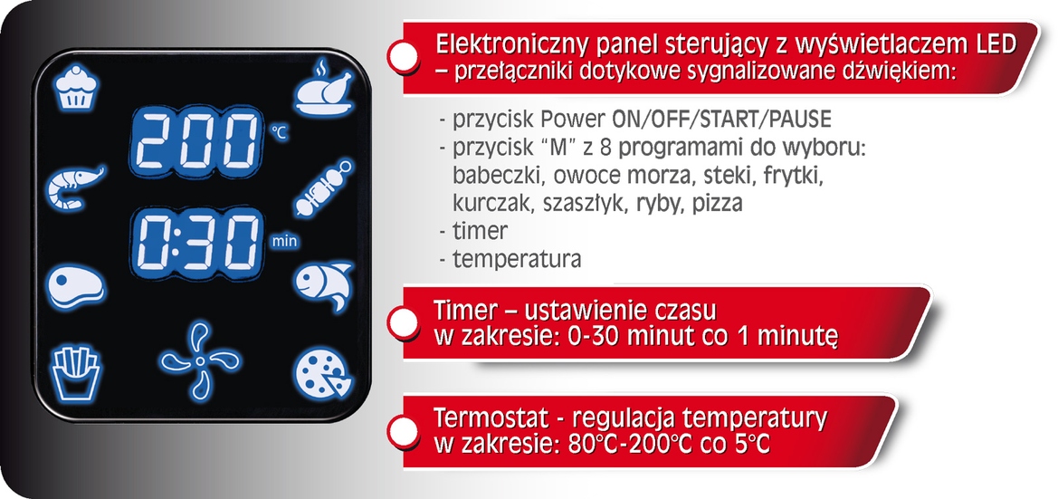 - електронна панель керування зі світлодіодним дисплеєм - сенсорні перемикачі зі звуковим сигналом: