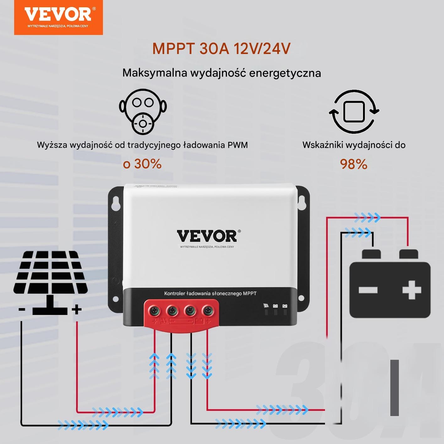 Професійне MPPT 30A Контролер зарядки - це сучасний пристрій, який забезпечує ефективні та стабільні управління сонячні системи. Завдяки MPPT (максимальне відстеження точки потужності), він навіть гарантує на 98% більш високу ефективність зарядки порівняно з традиційними регуляторами ШІМ. побудований -in модуль Bluetooth дозволяє віддалений моніторинг та контроль параметрів роботи за допомогою мобільного додатка.