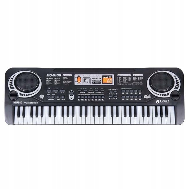 MQ 6106 — це клавіатура з мікрофоном для дітей, яка пропонує багато цікавих функцій і є ідеальним інструментом для гри та навчання грі на піаніно. Обладнання має 61 міні-клавішу (5 октав), 16 звуків, 10 ритмічних мінусовок, барабанні кнопки для самостійного відбивання ритму, вбудований режим уроку, а також можливість запису та подальшого відтворення музичних фраз. Крім того, ці електронні органи можна живити від електричної розетки або працювати від чотирьох батарейок АА, що робить їх повністю портативними.