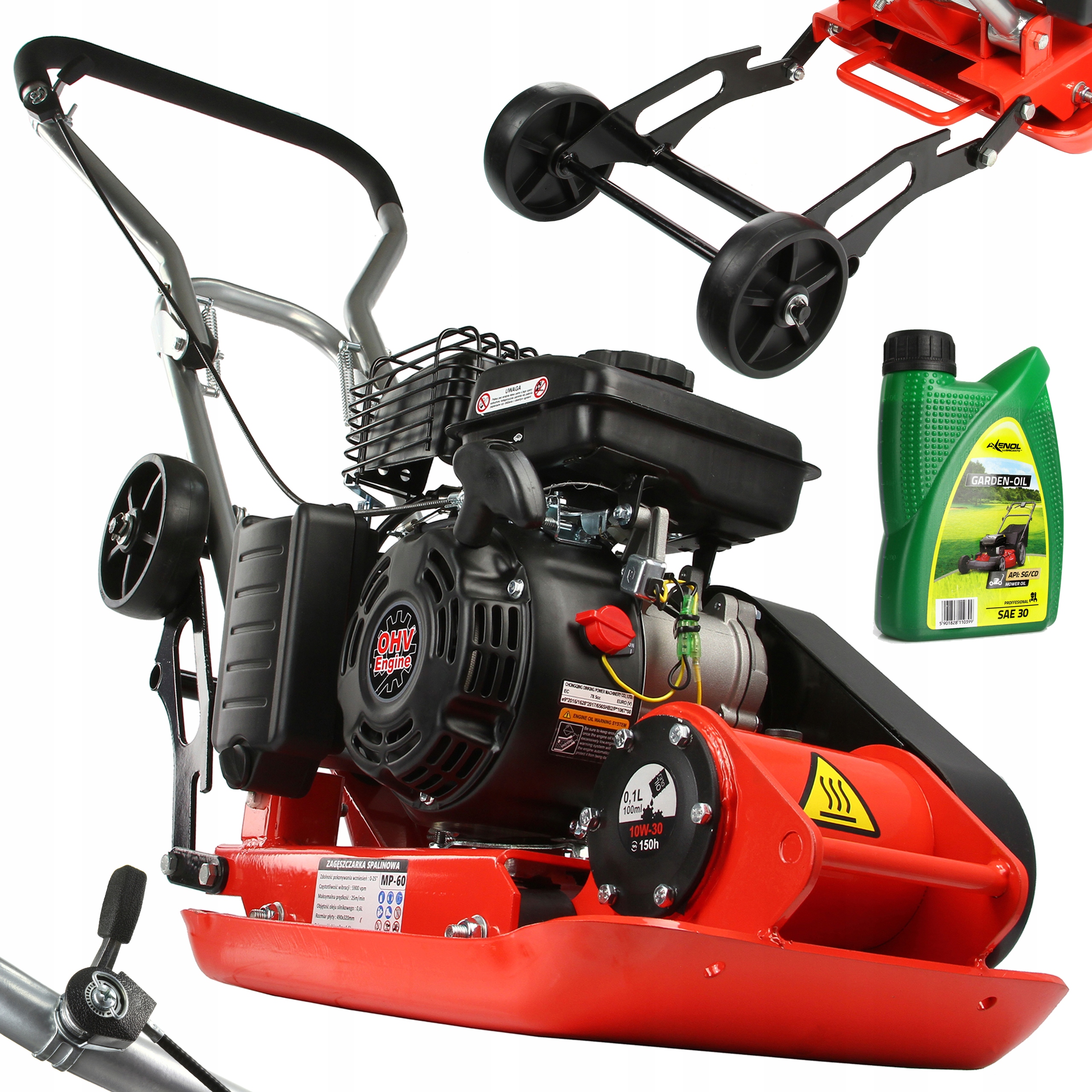 Компактор також оснащений складними транспортними колесами, що полегшує зміну положення під час роботи без особливих зусиль