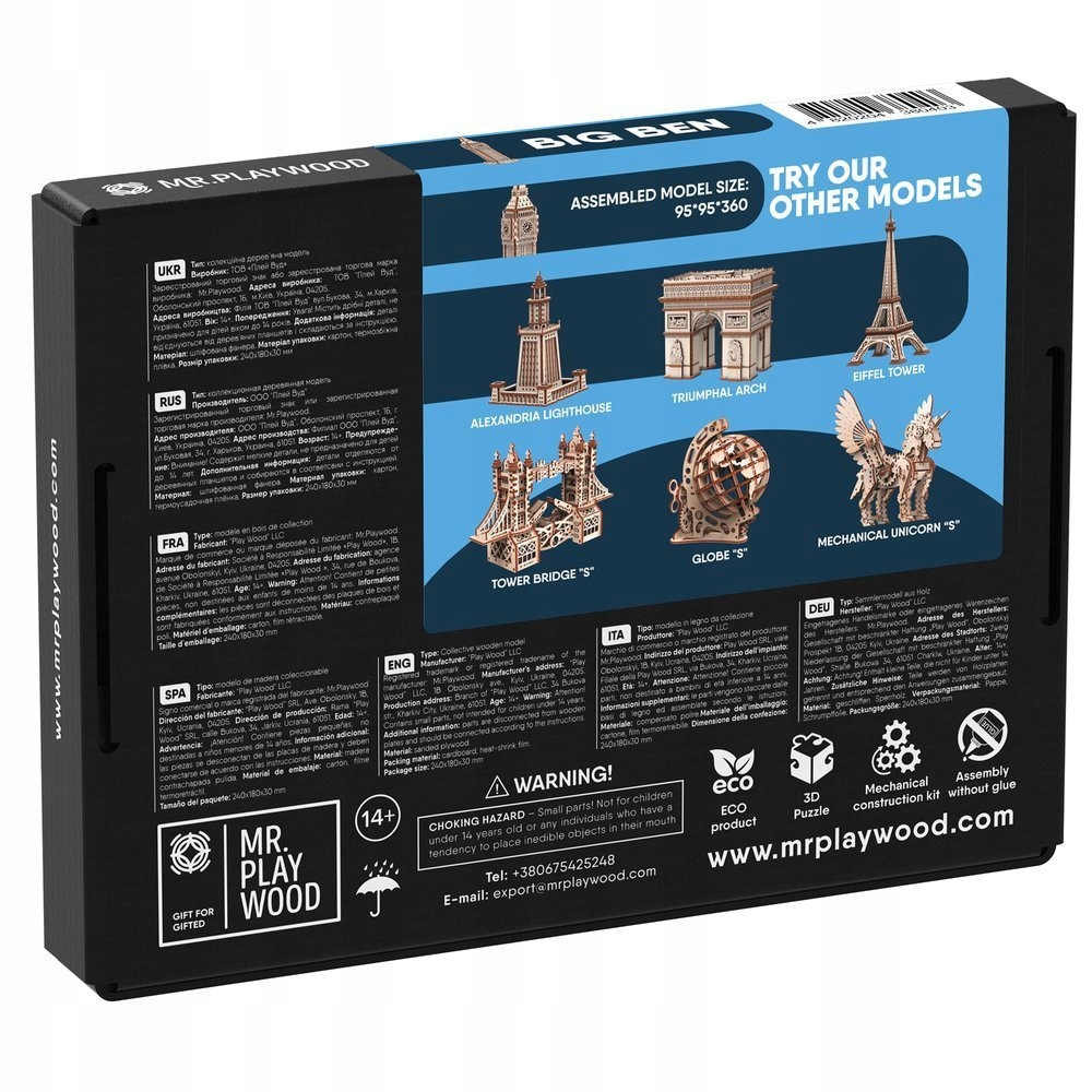 Немає клею, щоб зібрати цю модель! Все, що вам потрібно зробити, - це обережно відокремити частини від рами, , на яких вони є. Назва "Big Ben" насправді стосується 13-тонного дзвоника, що висить всередині вежі Вестмінстерського палацу. Основна прикраса вежі - 4 годинникові диски, що є чудовою хронометрією завдяки величезному маятнику, який регулюється щохвилини і майже ніколи не зупиняється. Зменшена копія Біг -Бену можна розмістити з дерев’яних деталей, що забезпечуються 3D -моделлю від MR.