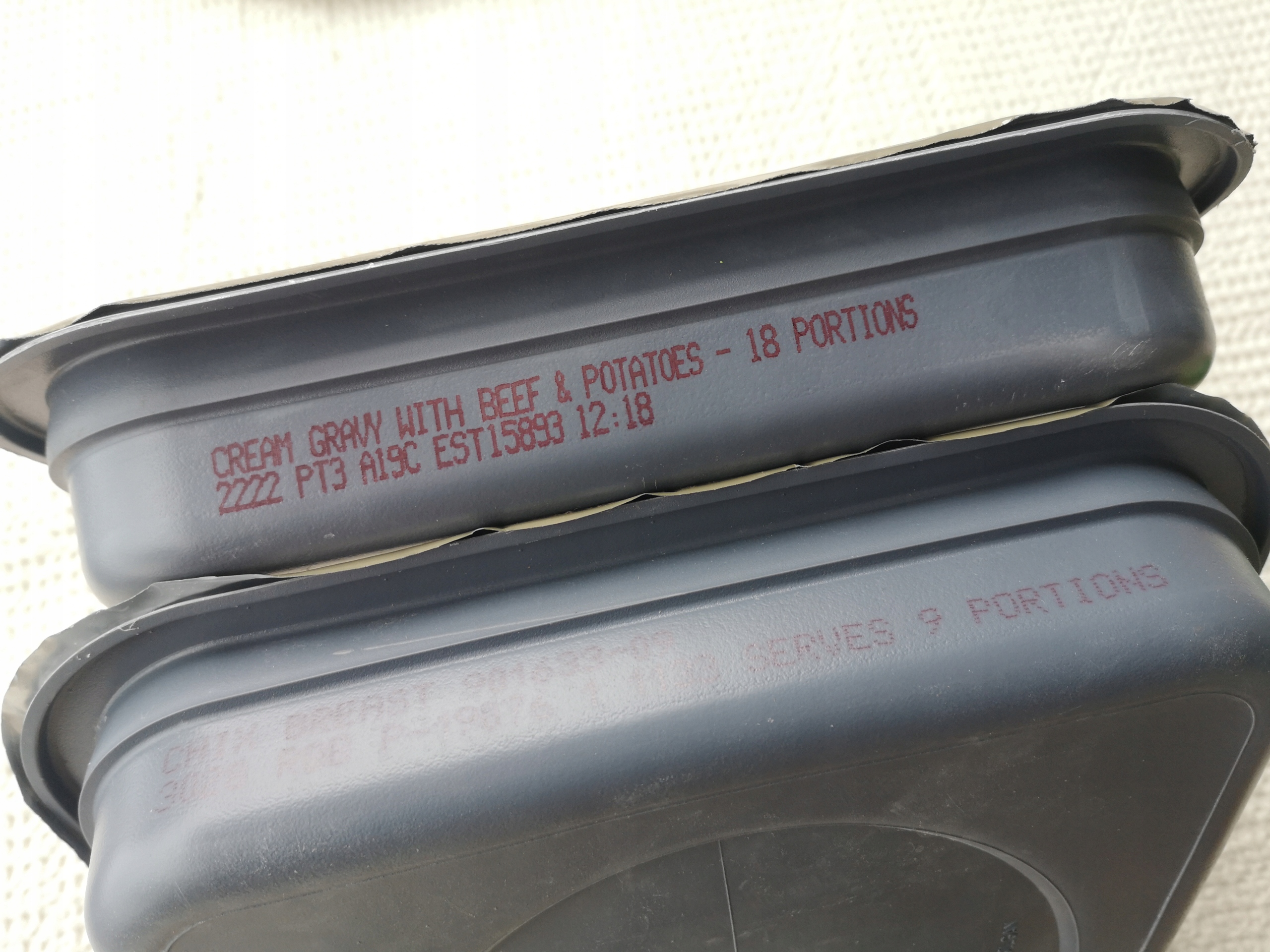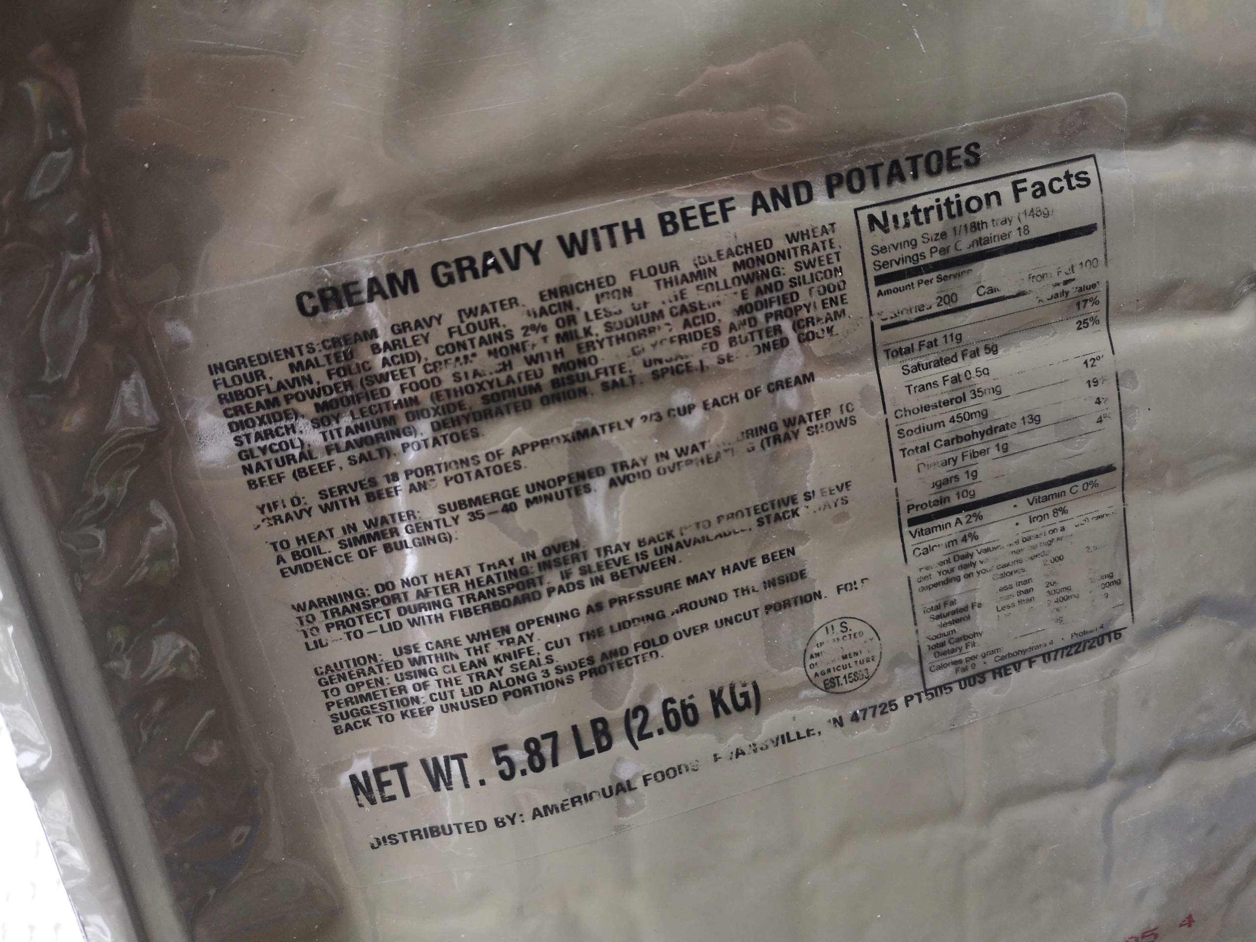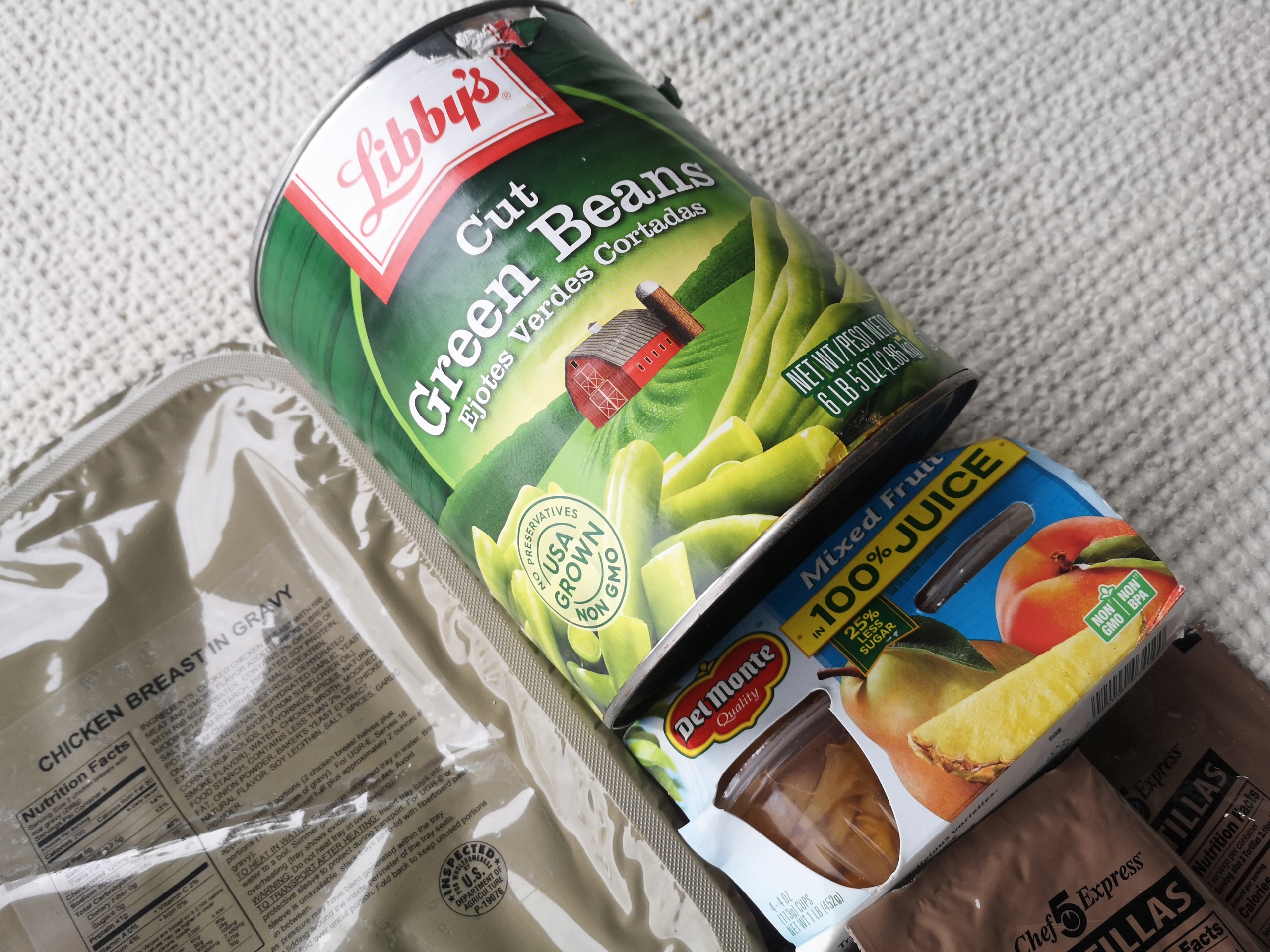 Куряча грудка в соусі (1 лоток = 9 порцій, опис упаковки) + яловичина в вершньому соусі з картоплею (1 Tack = 18 порцій, опис у упаковці) + банка зелених квасолів + тортилли (15pcs) + суміш фруктів із групових причин