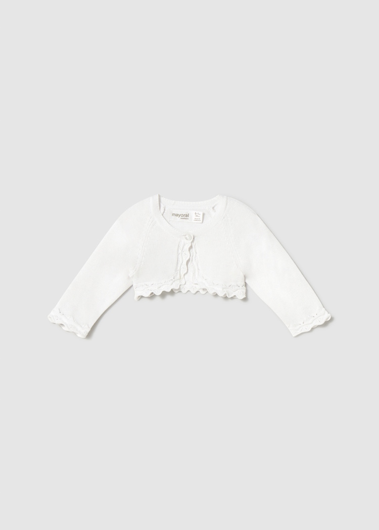 светр з рукавом Раглана для новонародженої дитини. Кріплення для однієї кнопки. М'який і приємний на дотик. Тритовий трикотаж. Прикраси: елементи відкритої роботи, хвилясті деталі.