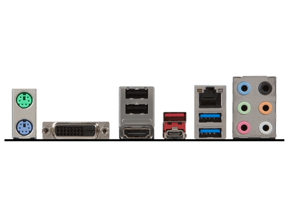 - Роз’єми: DVI, HDMI, 1 x RJ-45, аудіо, 2 x PS/2, 2 x USB 2.0, 3 x USB 3.0, 1 x USB-C, 2 x PCI-Express x16, 1 x PCI-Express x1, SATA