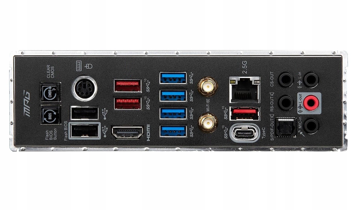 - Зовнішні роз'єми: 1 x usb тип C / 3 x USB 3.2 Gen. 2 Тип A / 4 x USB 3.2 Gen. 1 Тип A / 2 x USB 2.0 Type A / 1 X RJ45 (LAN) 2.5GBPS / 1 x HDMI / 5 x Audio / 1 x S / PDIF / 1 x PS / 2 Combo / 2 x WiFi antenna connector / 1 x BIOS Flash Button / 1 X Clear Clear CMOS Button
