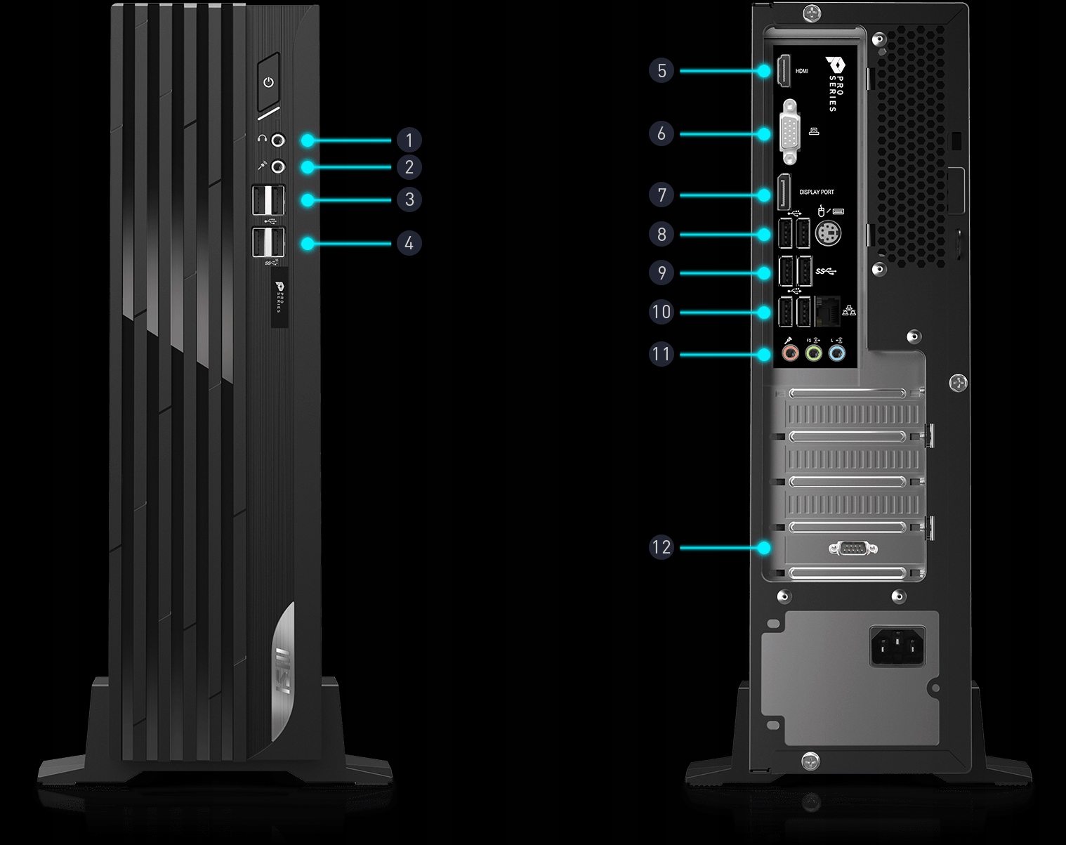 - З’єднувачі введення/виведення: Спереду : 1x вхід для мікрофона; 1x вихід для навушників; 2x USB 2.0 Type-A; 2x USB 3.2 Gen 1 Type-A; Задня панель: 1x HDMI (2.0) вихід; 1x вихід VGA; 1x RJ-45 [LAN ]; 4x USB 2.0 Type-A; 1x лінійний аудіовихід; 1x DP (1.4) вихід; 2x USB 3.2 Gen 1 Type-A; 1x лінійний аудіовхід; 1x лінійний аудіовихід; 1x вхід для мікрофона; 1x COM-порт RS-232