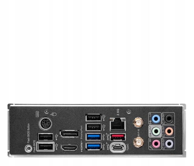 - Зовнішні роз'єми: HDMI - 1 шт.; USB 3.2 Gen. 1 - 2 шт.; USB 2.0 - 4 шт.; Аудіороз'єм - 6 шт.; DisplayPort - 1 шт.; Роз'єм Wi-Fi антени - 2 шт.; PS/2 клавіатура/миша - 1 шт.; Кнопка Flash BIOS - 1 шт.; USB Type-C - 1 шт.; USB 3.2 Gen. 2 - 1 шт.; RJ45 (LAN) 2,5 Гбіт/с - 1 шт.