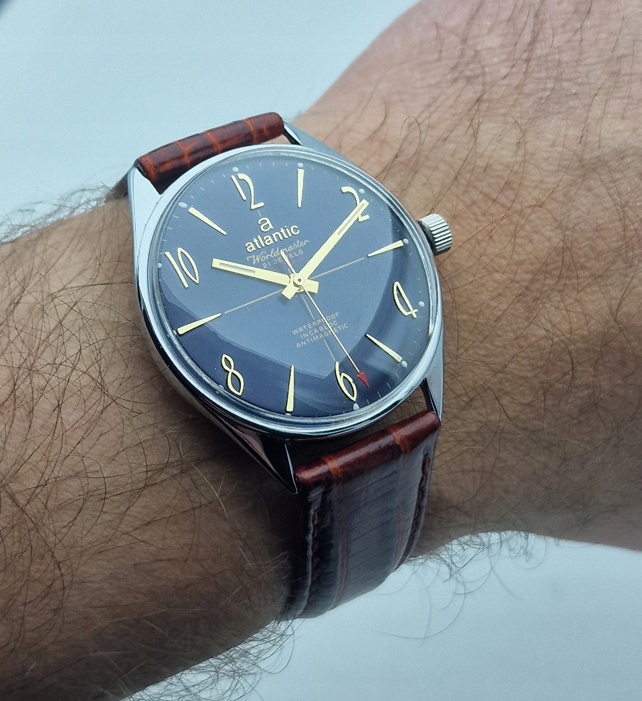 Цього разу у мене є наручний годинник для знавців і ентузіастів. Це класична модель годинника ATLANTIC WORLDMASTER ORIGINAL 1970-х років, в хромованому корпусі з системою INCABLOC і ANTIMAGNETIC. Годинник працює добре. В ідеальному стані…