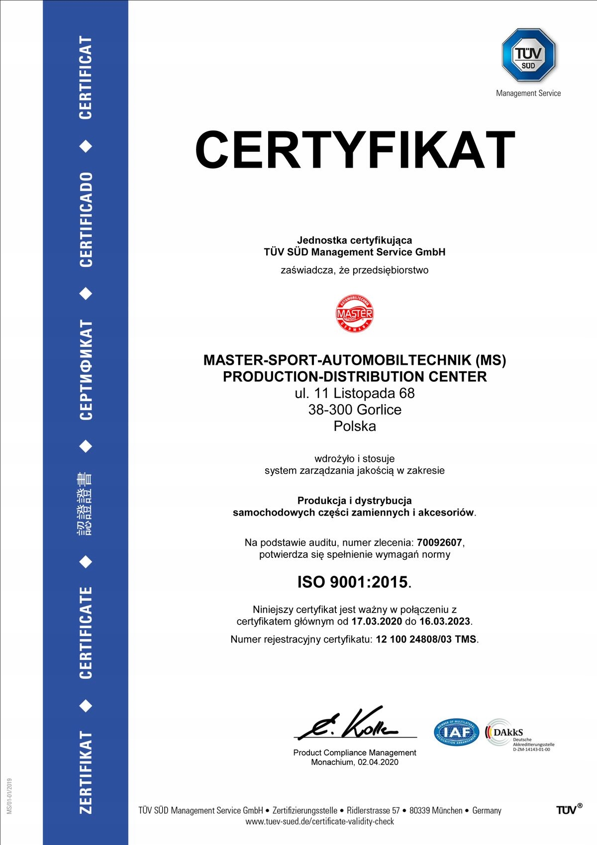 Усі продукти виготовляються з підтримання найвищих стандартів якості, підтверджених необхідними сертифікатами; Як і ISO 9001 Tüv Süd Management Service GmbH, Мюнхен, Німеччина. Master-Sport Autmobiltechnik (MS) GMBH-уповноважений постачальник даних до каталогу TECDOC