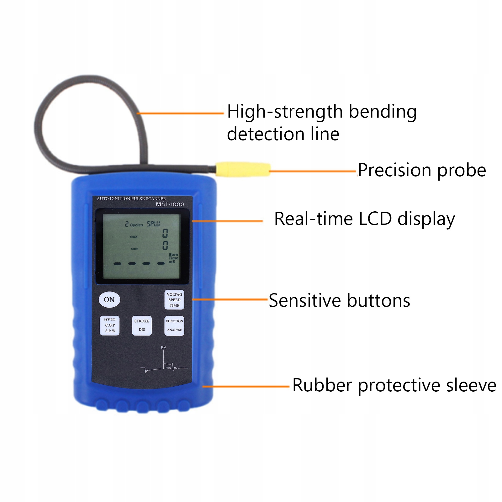 1. Мінімум і максимальні показання вибраної функції постійно записуються. Без розбирання, без проводки, без контакту, зонд розташований біля лінії високої напруги, щоб безпосередньо виявити сигнал запалювання.
