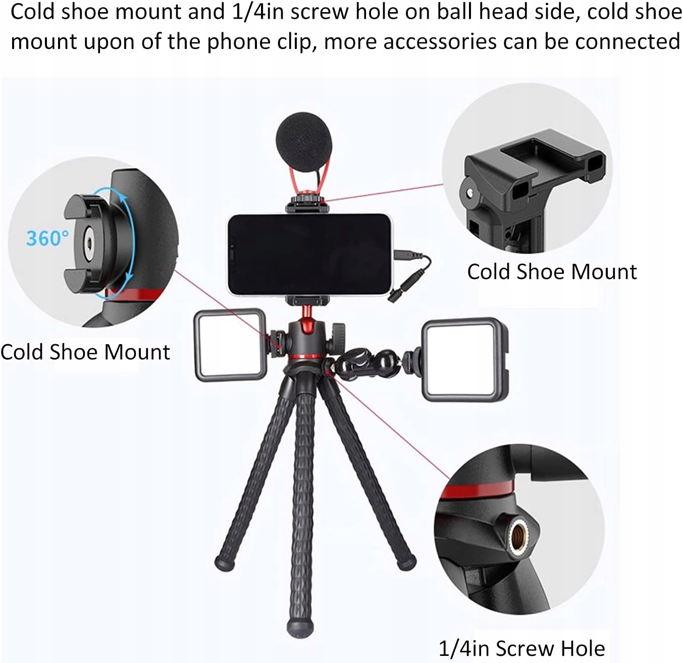Цільна конструкція тримача мобільного телефону розширюється до універсальної коробки для зберігання тримача мобільного телефону, яку можна встановити безпосередньо з камерою. Універсальна кульова головка з поворотом на 360 градусів може регулювати різні кути зйомки, надаючи вам більше можливостей. Холодний монтаж з 05 футів і 14-дюймовим отвором для гвинта з боку кульової головки. Холодний монтаж з 05 футів на телефонному затискачі може вмістити 05 або більше аксесуарів. Штатив зі знімною кульковою головкою з високоеластичної гуми та mogx 05 із кульковою головкою можна використовувати окремо для широкого застосування. Сумісний із портативним і легким мобільним телефоном шириною 685 см і діагоналлю 2433 дюйми.