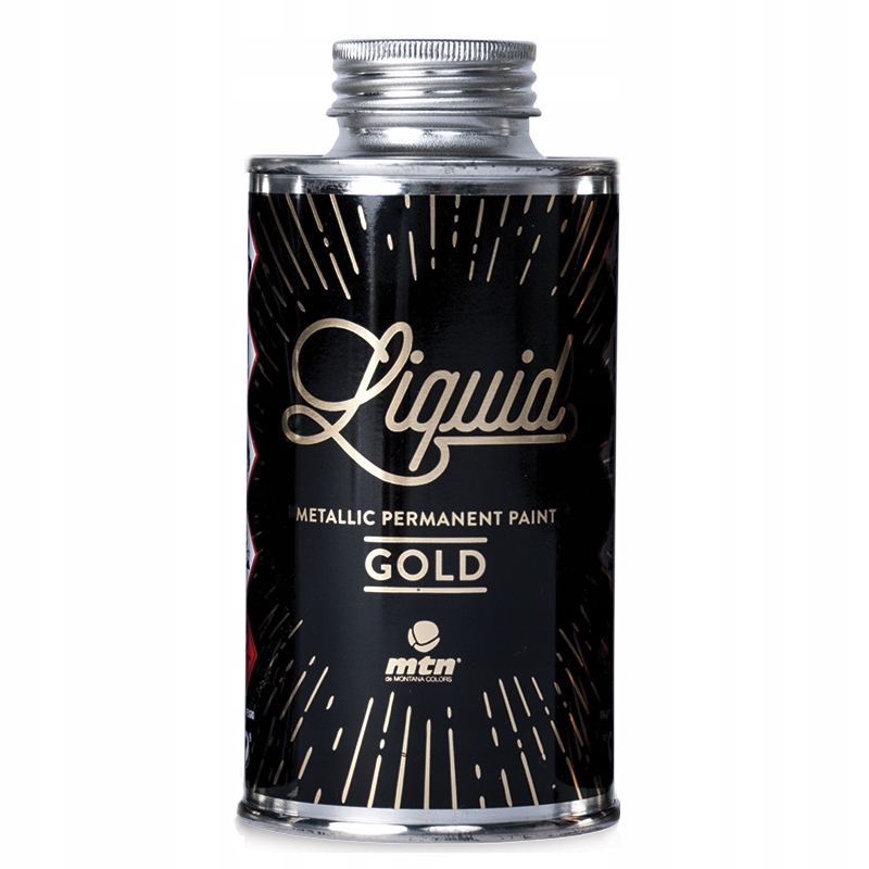 MTN Liquid — це міцна металева фарба з відмінною адгезією та покриттям. Спеціально розроблений для використання з пензлями, аерографом або іншими техніками мистецтва або живопису. Рідина MTN, створена з акрилових смол і пігментів на основі розчинників, доступна в трьох кольорах: золото, срібло та мідь. Всі три упаковані в металеві контейнери по 200 мл. Високоякісна швидковисихаюча фарба з металевим ефектом, ідеально підходить для робіт, що вимагають блиску та непрозорості.