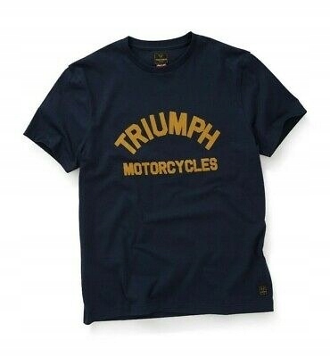 Темно-синя бавовняна футболка зі стилізованим, м’яким, пігментованим написом Triumph Motorcycles у кольорі Matlu Gold на грудях і новою характерною нашивкою з логотипом Triumph. на нижньому подолі.