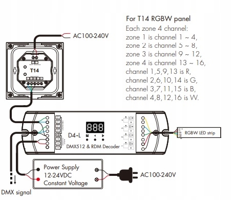 T14B -це 4 -зонна стінова панель для управління багатоколеною світлодіодною освітленням RGB+W (наприклад, RGBW LED SRID). Керування освітлення може відбутися бездротовим 2,4 ГГц (RGBW світлодіодними приймачами) або проводити через вихідний сигнал DMX512 з декодером DMX. Використовуючи уражену панель, освітлення можна увімкнути / вимкнути, темно / освітлено та контролювати його кольори. Рідке та точне регулювання кольору проводиться шляхом дотику до кольорового колеса. Торгові клавіші мають світлодіодний індикатор та акустична сигналізація. Вхідна напруга 100-240V змінного струму. Діапазон роботи панелі як бездротового контролера становить 10 метрів. Ця ультрашвидка, скляна панель характеризується високою міцністю. Він має сучасну чорну обробку. Установка в традиційній установці. Продюсер Skydance.