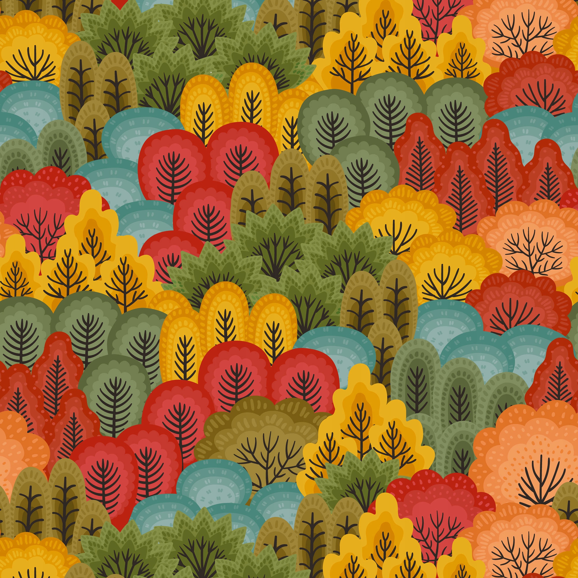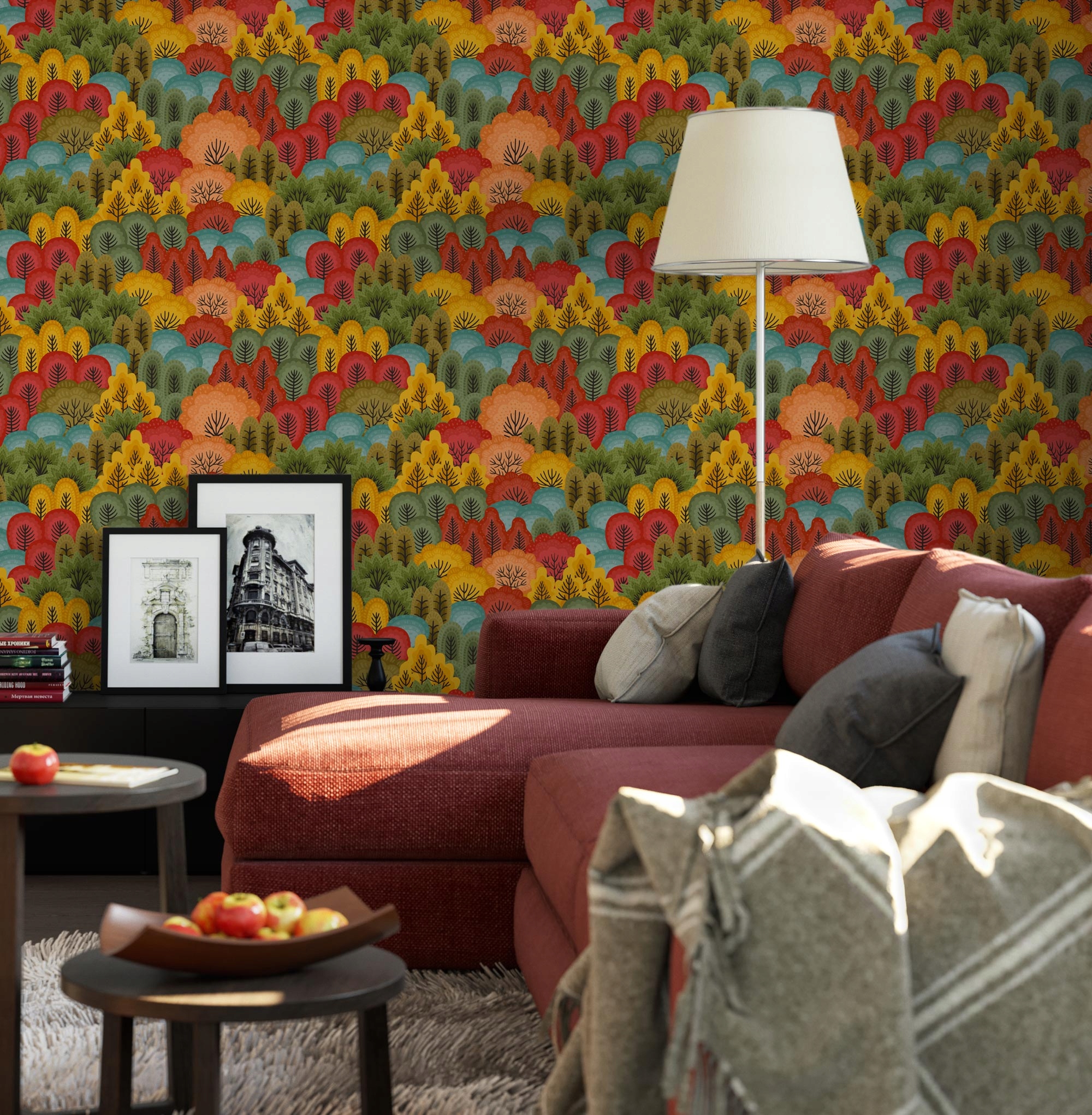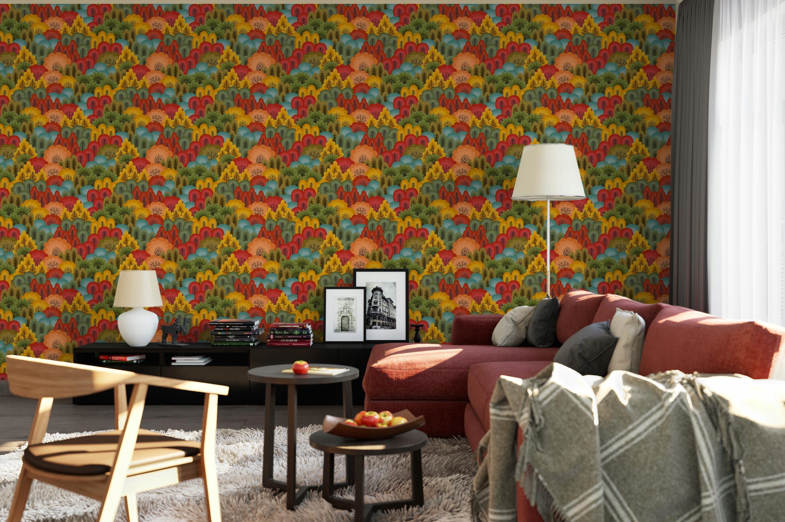 Візерунок у красивих кольорах осінніх дерев. Мультяшне зображення лісу в стилі мультфільму. Шпалери прикрасять кімнату як хлопчика, так і дівчинки. Теплі, яскраві кольори та відсилання до природи створять у кімнаті затишну, домашню атмосферу.