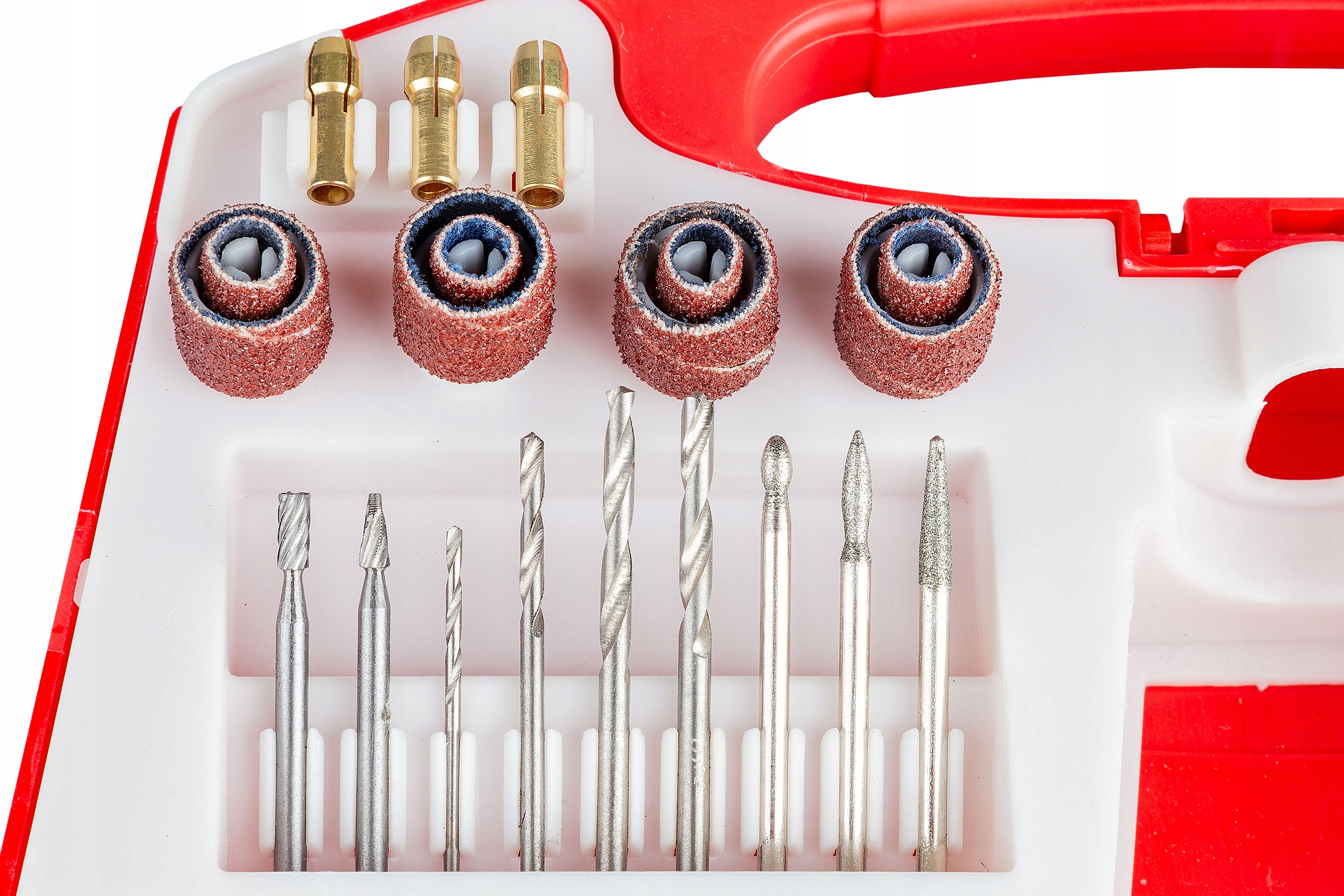 Кнопка блокування дозволяє швидко змінювати підказки. Спеціально посилений кільцевий затискач гарантує безпечне кріплення наконечників. У набір входять цанги різних розмірів, завдяки чому пристрій працює практично з усіма доступними на ринку інструментами. Регулювання швидкості забезпечує адаптацію робочої швидкості до типу оброблюваних матеріалів.