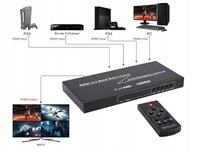 Пристрій дозволяє підключати чотири пристрої введення через HDMI і відображати їх на одному приймачі