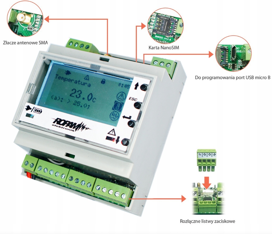 Комплект із модуля оповіщення та керування Ropam MultiGSM 2 GSM GSM та панелі LCD-HMI для DIN-рейки може використовуватися в: