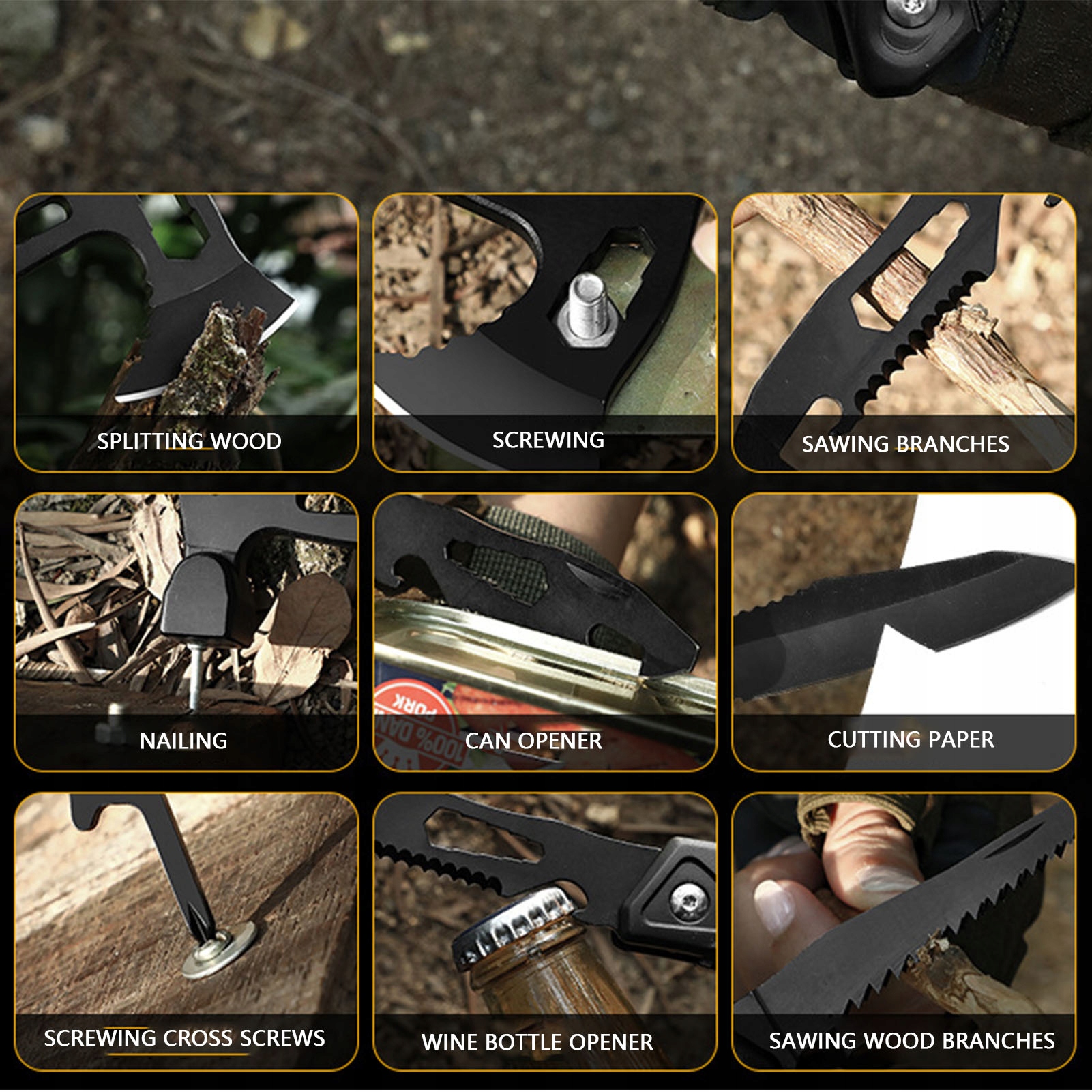 1, БАГАТОФУНКЦІОНАЛЬНІСТЬ: багатофункціональна сокира для зовнішнього використання може легко виконувати копання, копання, забивання молотком, різання, рубання та інші функції. 2、Сильне затискне зусилля: кемпінгова сокира має високу затискну силу та заощаджує зусилля та час, підходить для повсякденних або екстрених ситуацій. 3、Ергономічна рукоятка: багатофункціональний молоток має ергономічну конструкцію з делікатною ручкою, зручною та нековзкою, безпечною у використанні. 4, НЕРЖАВІЮЧА СТАЛЬ: багатоцільова сокира виготовлена з нержавіючої сталі, її нелегко іржавіти та деформувати, вона компактна та легка, не потребує додаткового тягаря під час подорожей на вулиці, її легко носити з собою. 5、Широке застосування: багатофункціональний інструмент для кемпінгу з сокирою широко використовується в кемпінгу, риболовлі, піших прогулянках, кулінарії, пікніках, сім’ї, самостійному керуванні автомобілем, DIY та інших видах активного відпочинку.