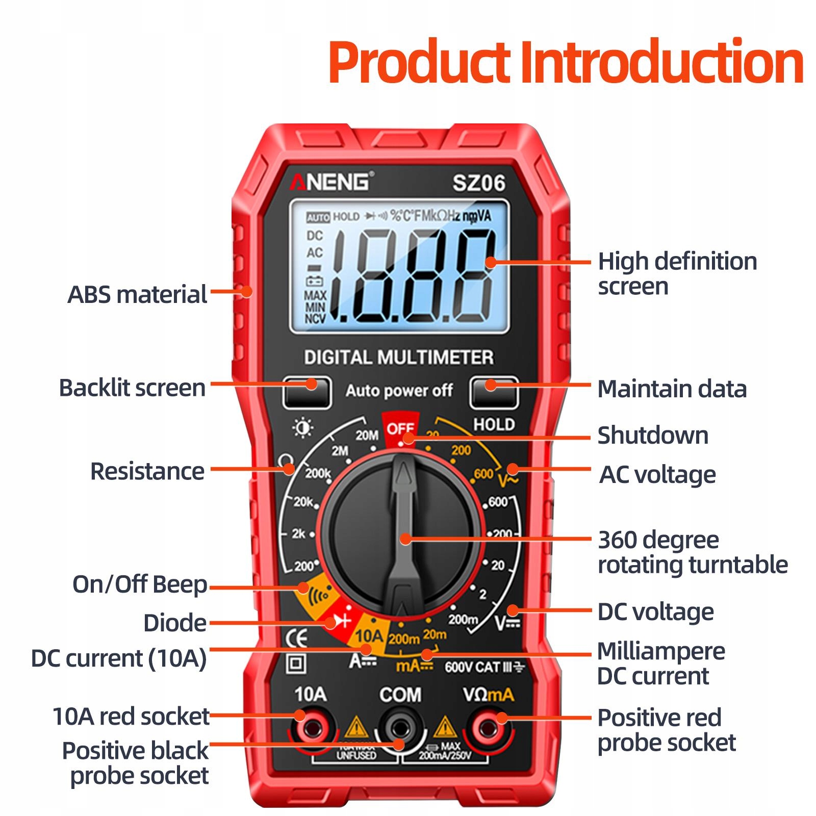 [багатофункціональний] цифровий мультиметр, розроблений та виготовлений відповідно до міжнародних стандартів електричної безпеки, використовується для вимірювання постійного струму, постійного струму, опір, вмикання звукового сигналу/вимкнення, із зупинкою даних, виявленням акумулятора та іншими. 4