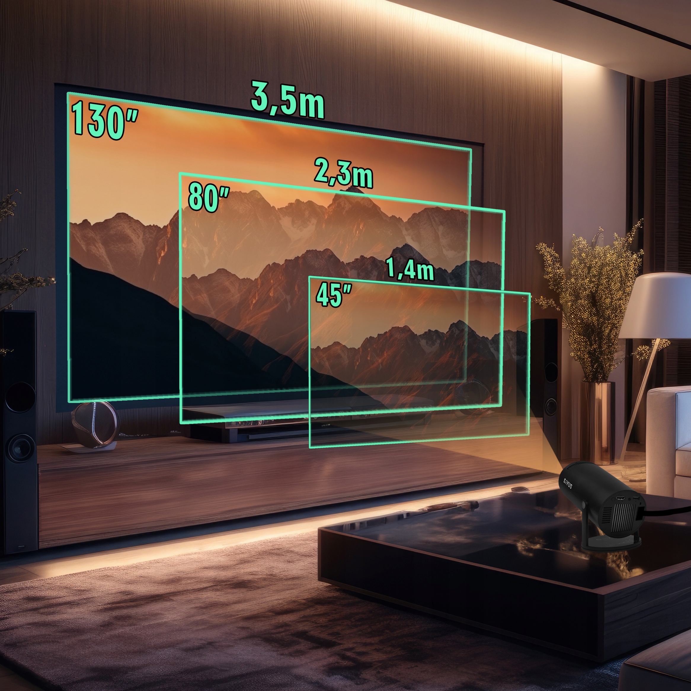 Завдяки обертовій основі проектора ми можемо налаштувати відповідний кут, щоб ідеально підігнати проекцію до простору.