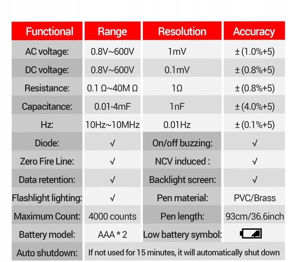 З функцією ліхтарика: PEN-мультиметр має ліхтарикна наконечнику, який допомагає ефективно освітлювати темні та важкодоступні місця. -бачте області, що дозволяє легко працювати в умовах слабкого освітлення. Завдяки ергономічному дизайну та портативному розміру ліхтарик можна брати куди завгодно, що дає вам можливість працювати в різних середовищах.