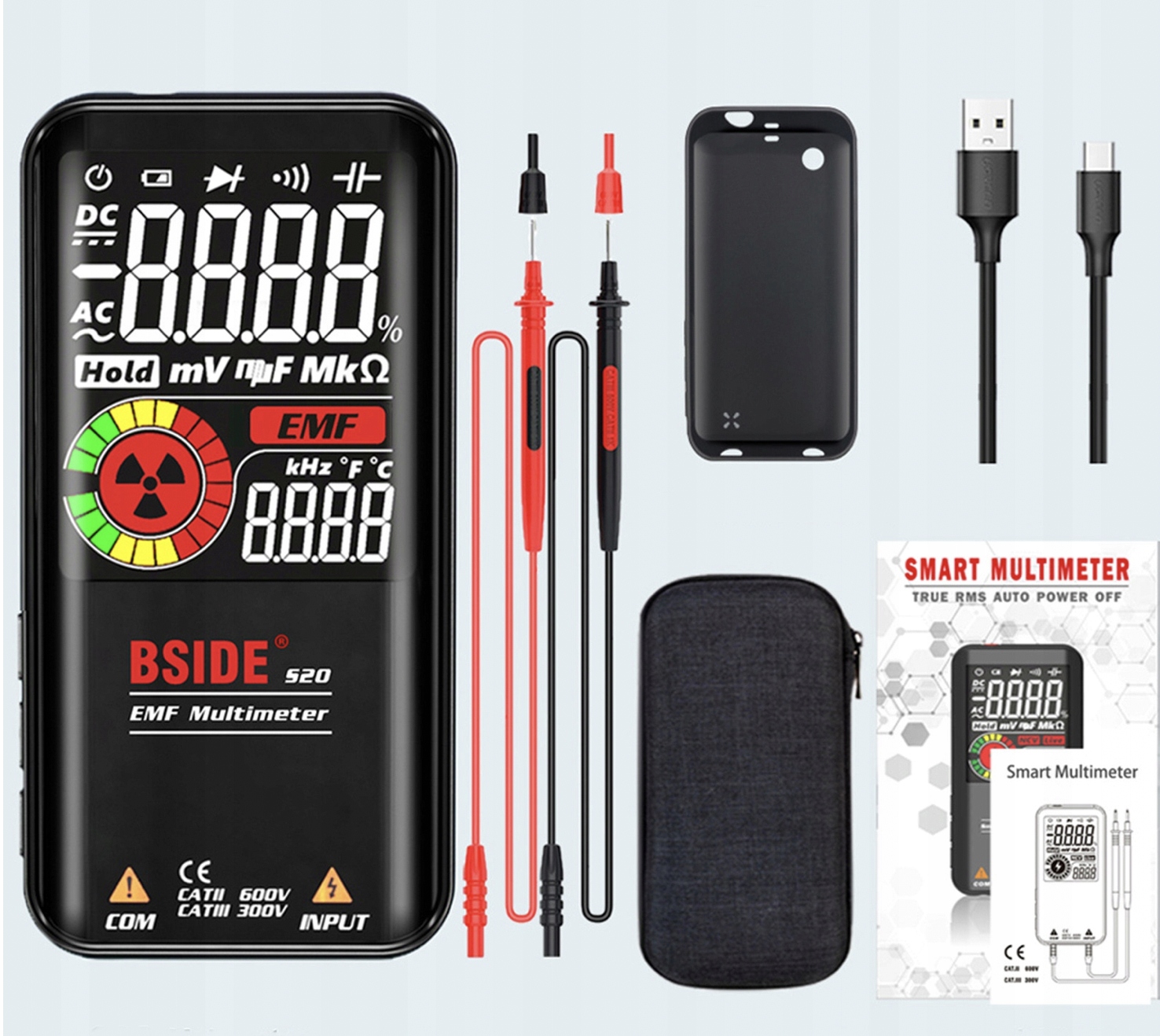 - БЕЗПЕКА: BSIDE S20 підтримує повне перевантаження діапазону вимірювань. захист і подвійний ізоляційний захист. Пристрій також розроблено з рівнями безпеки CAT.II 600 В і CAT.III 300 В.