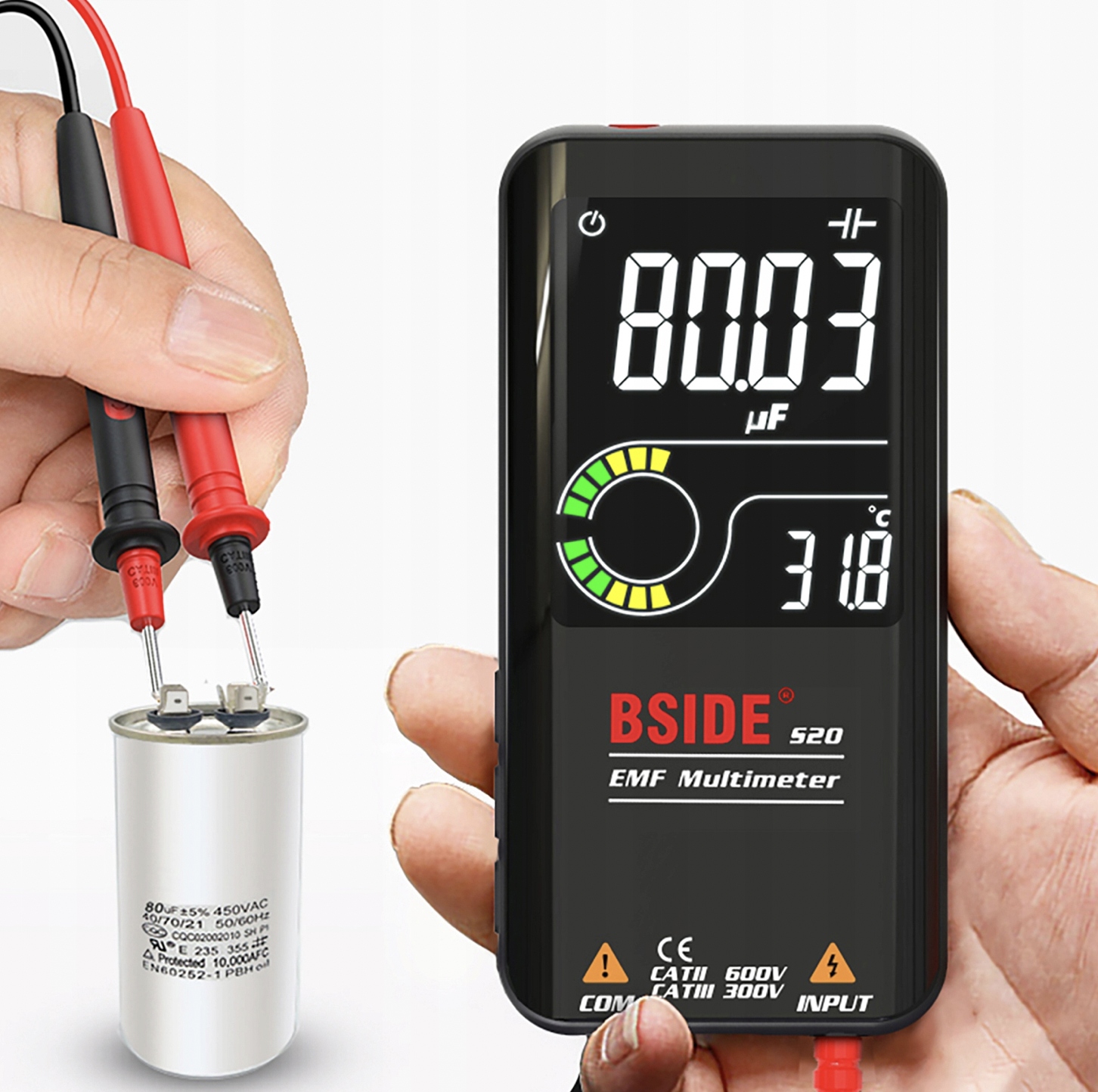 BSIDE S20 має захист від перевантаження для повного діапазону вимірювання та подвійний захист ізоляції. Пристрій також розроблено з рівнями безпеки CAT.II 600 В і CAT.III 300 В.