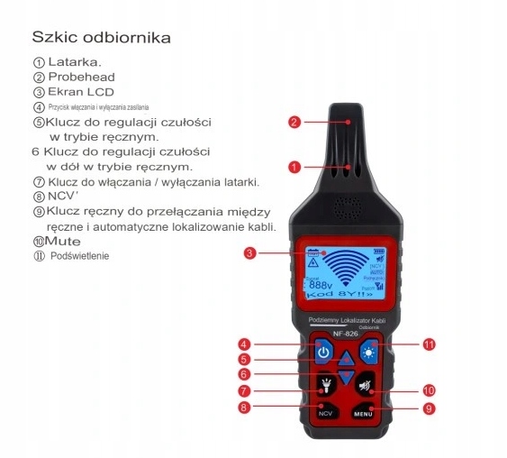 Пристрій NF-826 дозволяє знаходити та прокладати кабелі. Ідеально підходить для розміщення кабелів у стінах, підлозі та під землею. Завдяки цьому ви можете швидко знайти запобіжники (вимикачі) і призначити їх певним ланцюгам. За допомогою локатора NF-826 ви можете легко знайти пошкодження (обриви, короткі замикання) у вбудованих кабелях, напр. системи теплої підлоги. Також легко виявляє проводи та труби під напругою.