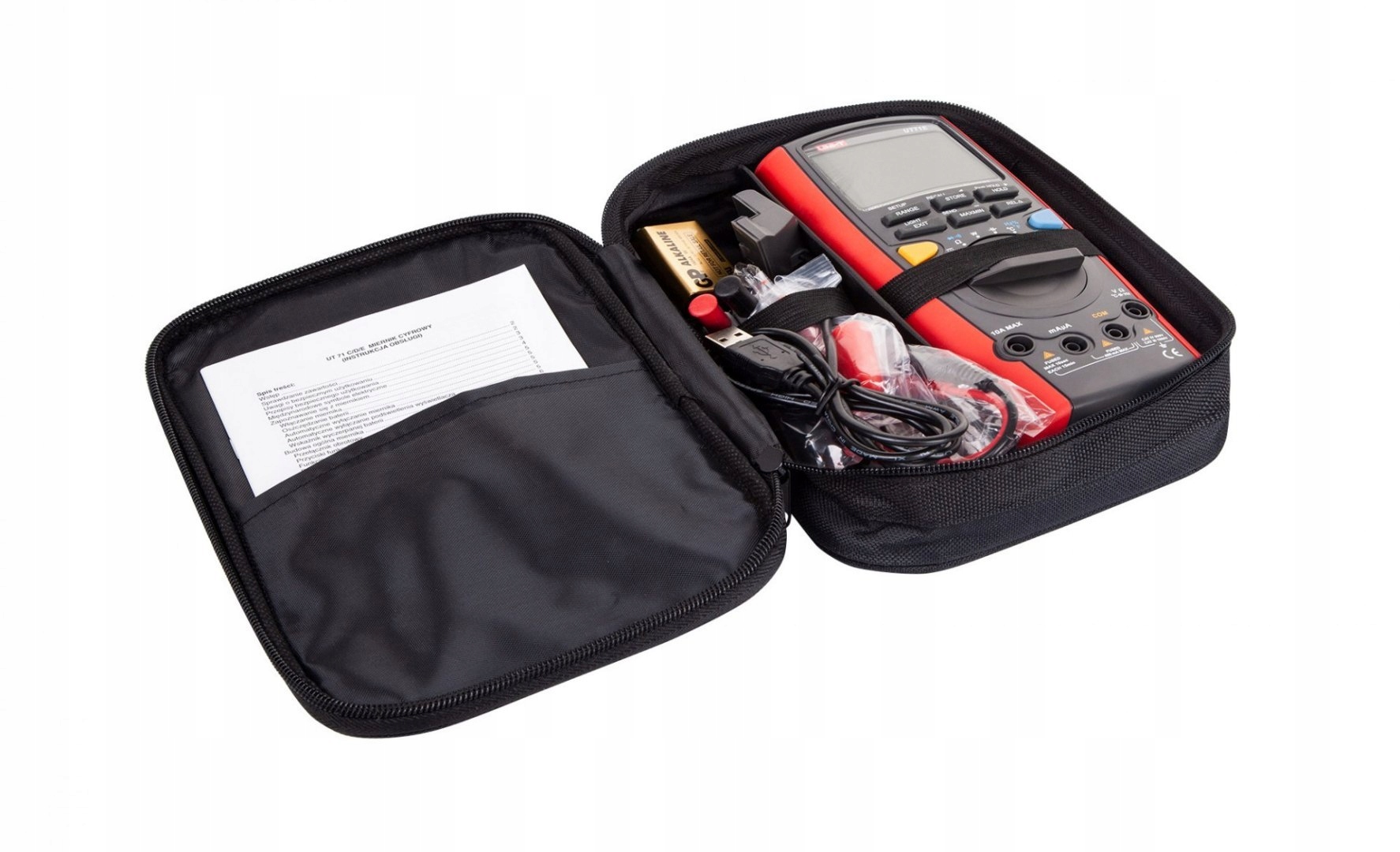 - Аксесуари: батарея, тестові щупи, затискачі «крокодил», кабель із затискачами «крокодил» , зонд для вимірювання температури , прилад для вимірювання потужності, кабель USB, футляр, CD