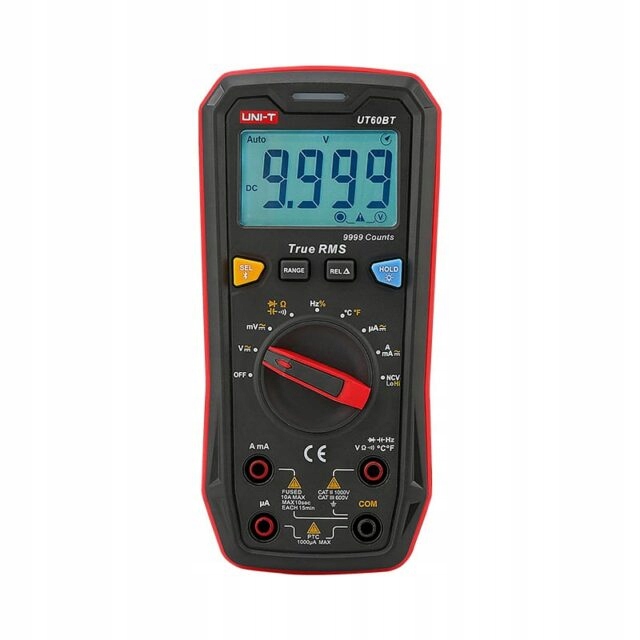 UT60BT - це цифровий мультиметр із діапазоном дисплея 9999, що дозволяє мені вимірювати фактичні значення ефективної напруги та струму, як з автоматичним, так і з ручним вибором діапазону. Він має захист перевантаження 1000 В RMS у всіх діапазонах, діапазон струму захищається трубчастим запобіжником 10 A/1000 В, 6,35 х 32 мм. Якщо ви підходите до граничних значень ≥990,0 В / ≥9,900A під час вимірювання та струмів, у випадку перевищення граничних значень ввімкнеться, і знак "OL" буде відображатися. Крім того, це дозволяє вимірювати опір, ємність, температуру, частоту, коефіцієнт заповнення, безперервність ланцюга та напівпровідникові проходи. Система була оптимізована для неконтактного вимірювання електричного поля у двох суб -регресах. Мультиметр оснащений сучасним процесором зі швидким аналого-цифровим перетворювачем (перетворення 3 рази/с) та передачею вимірюваних значень за допомогою Bluetooth в низькоенергетичній бездротової технології 802.15.4. , для мобільного телефону або планшета з встановленим додатком Connect.