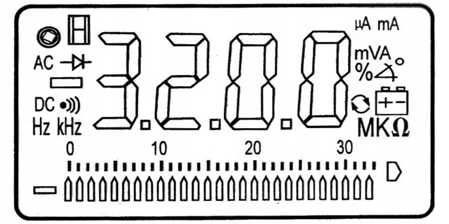- Дисплей: дворядковий РК-дисплей 3½ цифри, максимальний дисплей 3200