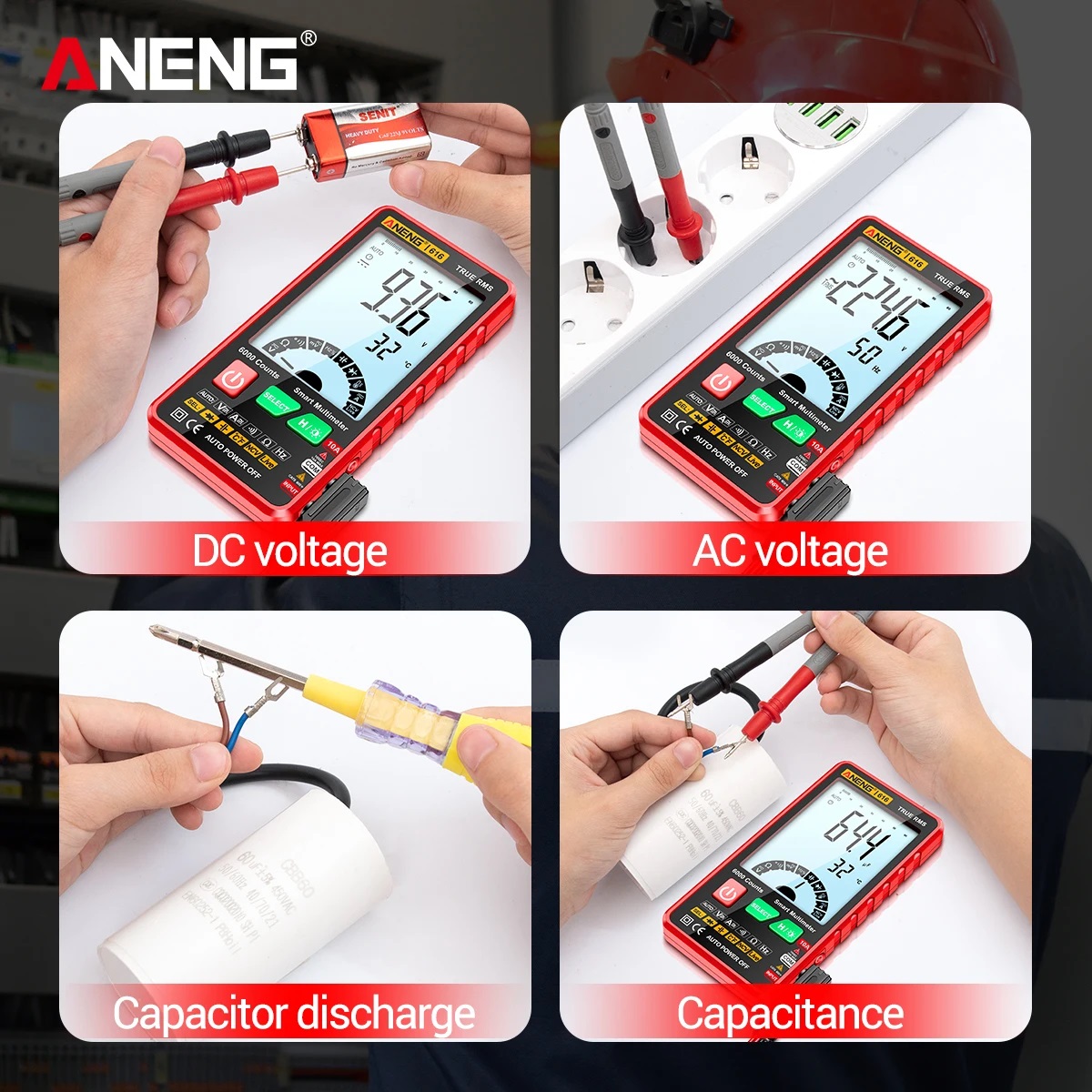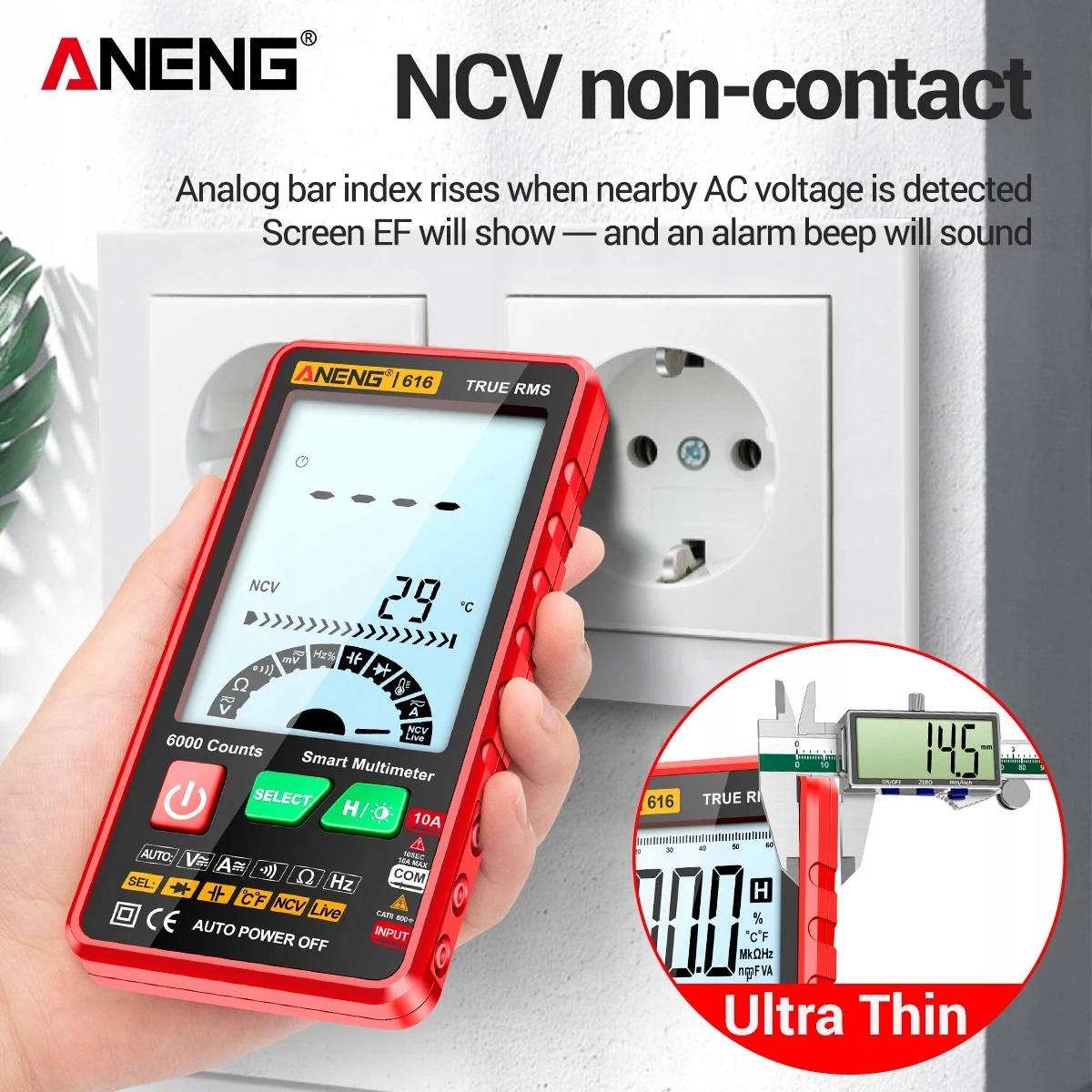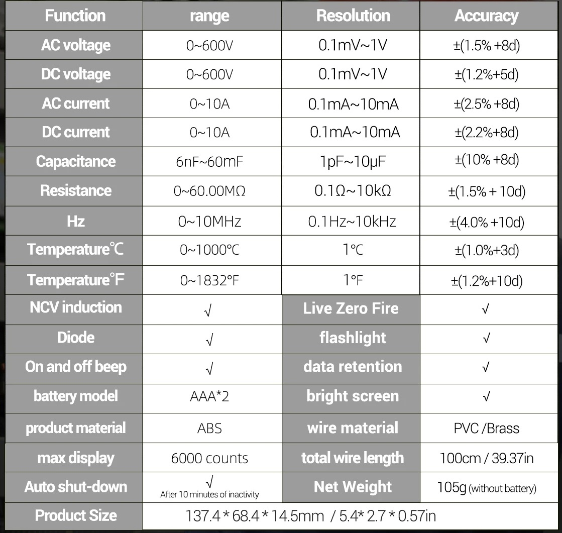ncv неконтактне напруга виявлення: Розмістіть датчик NCV ближче до вимірюваного кабелю, індикатор аналогового смуги збільшується, коли напруга змінного струму виявляється поблизу, на екрані показано "EF" та Сигнал тривоги буде звучати. : З 3,5 -дюймовим екраном Великий РК -дисплей, зручно перевіряти вимірювані дані на перший погляд. використовувати та зношуватися. Побудований -високоефективна мікросхема, щоб забезпечити його точність.