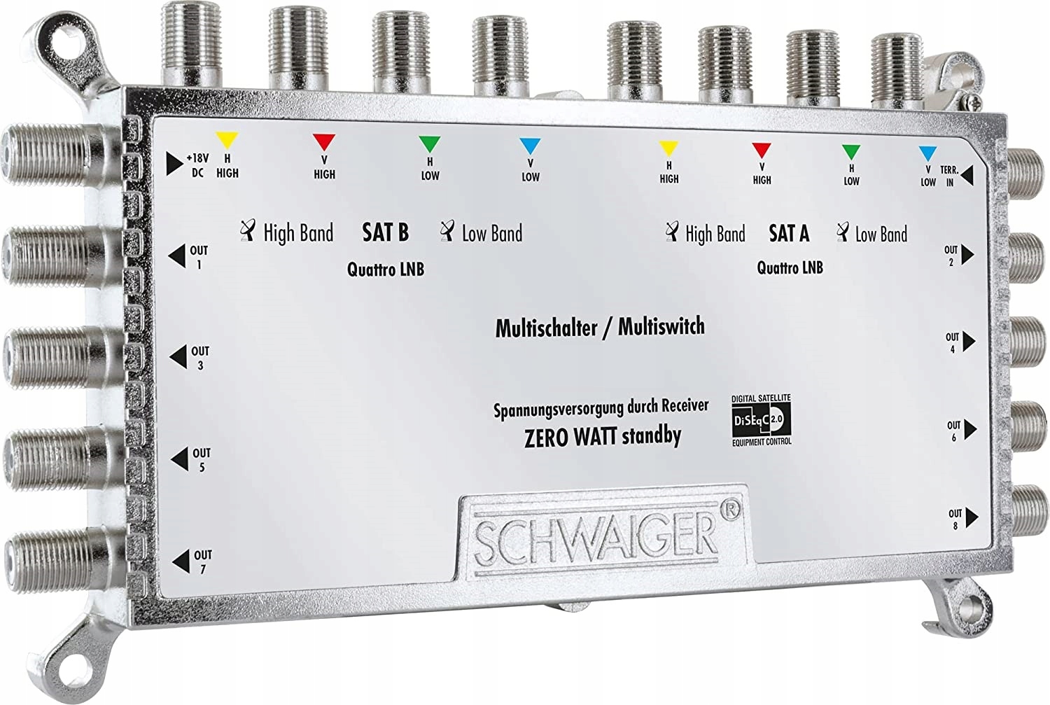 Цей мультикомутатор Schwaiger розподіляє цифрові сигнали з двох супутників до 8 користувачів. Для живлення сигналу необхідно використовувати два перетворювачі Quattro. Усі учасники можуть самостійно скористатися повною пропозицією програми. Цей мультисвіч живиться виключно від підключеного приймача. Якщо потужності приймача недостатньо для забезпечення мультисвіча достатньою кількістю енергії, ми включили зовнішнє джерело живлення у вміст коробки. Якщо жоден приймач не ввімкнено, енергоспоживання мультисвіча та підключених LNB у режимі очікування становить 0 Вт.