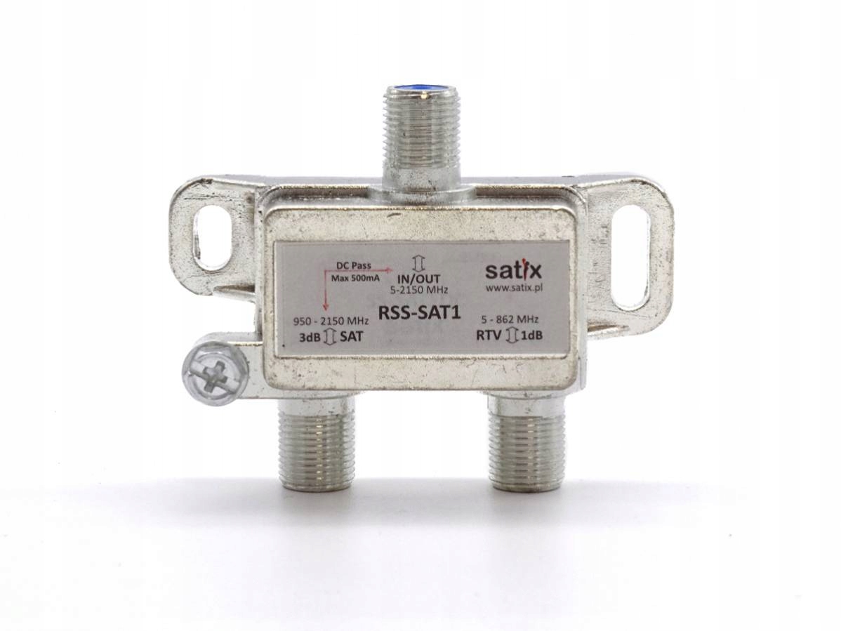 Об'єднувач сигналів RTV-SAT типу RSS-SAT1 - призначений для об'єднання радіо, телевізійних і супутникових сигналів. Комбайнер RSS-SAT1 оснащений двома вхідними портами для коаксіального кабелю, що подає радіочастотний сигнал: для входу RTV (5 ÷ 862 МГц) і для входу SAT (940 ÷ 2150 МГц). Об'єднувач сигналів RTV-SAT типу RSS-SAT1 також може працювати як розгалужувач сигналу RTV-SAT типу RSS-SAT1 - призначений для розділення радіо, телевізійних і супутникових сигналів. Спліттер RSS-SAT1 оснащений одним вхідним портом для коаксіального кабелю і двома вихідними портами для радіочастотного сигналу: для виходу RTV (5 ÷ 862 МГц) і для виходу SAT (950 ÷ 2150 МГц). Розгалужувач сигналу RTV-SAT типу RSS-SAT1 також може працювати як об’єднувач сигналу RTV-SAT.