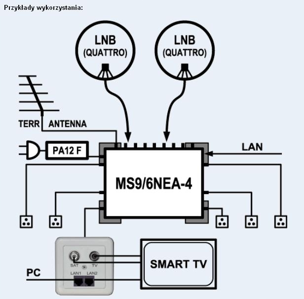 Мультисвітч EMP-Centauri MS9/6NEA-4 використовується для розподілу двох сигналів SAT, сигналу DVB-T та Інтернету до 6 користувачів через коаксіальний кабель.