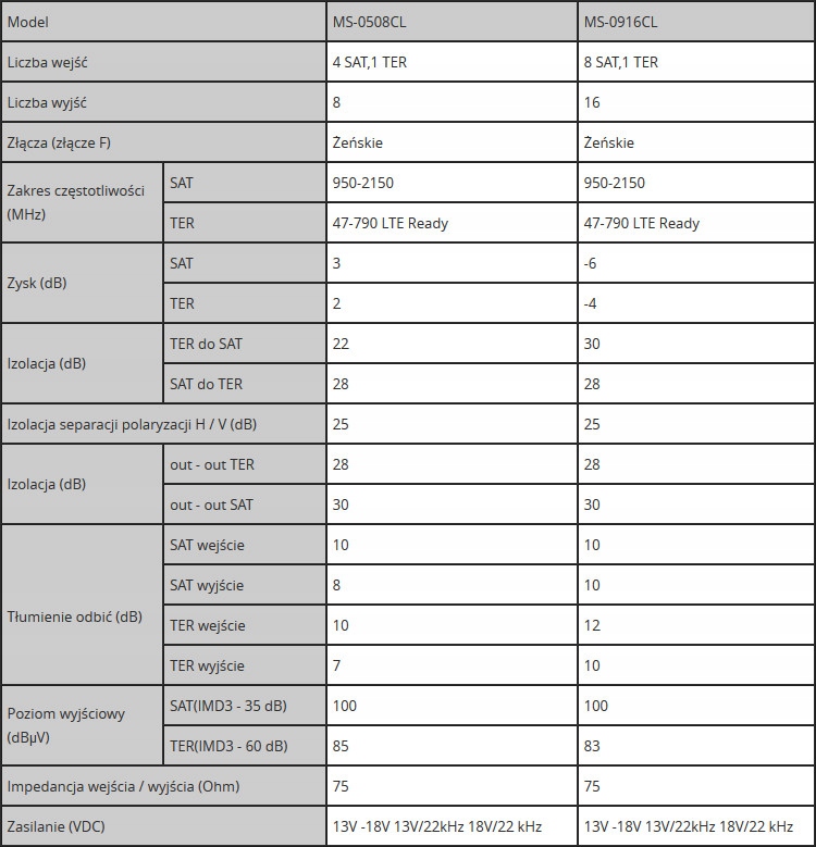 Каскадний мультисвіч Spacetronik з 5/5 на 8 MS-0508CL дозволяє підключити один супутниковий і цифровий ефірний телевізійний сигнал і відправити їх 8 одержувачам. Поставляється з блоком живлення.