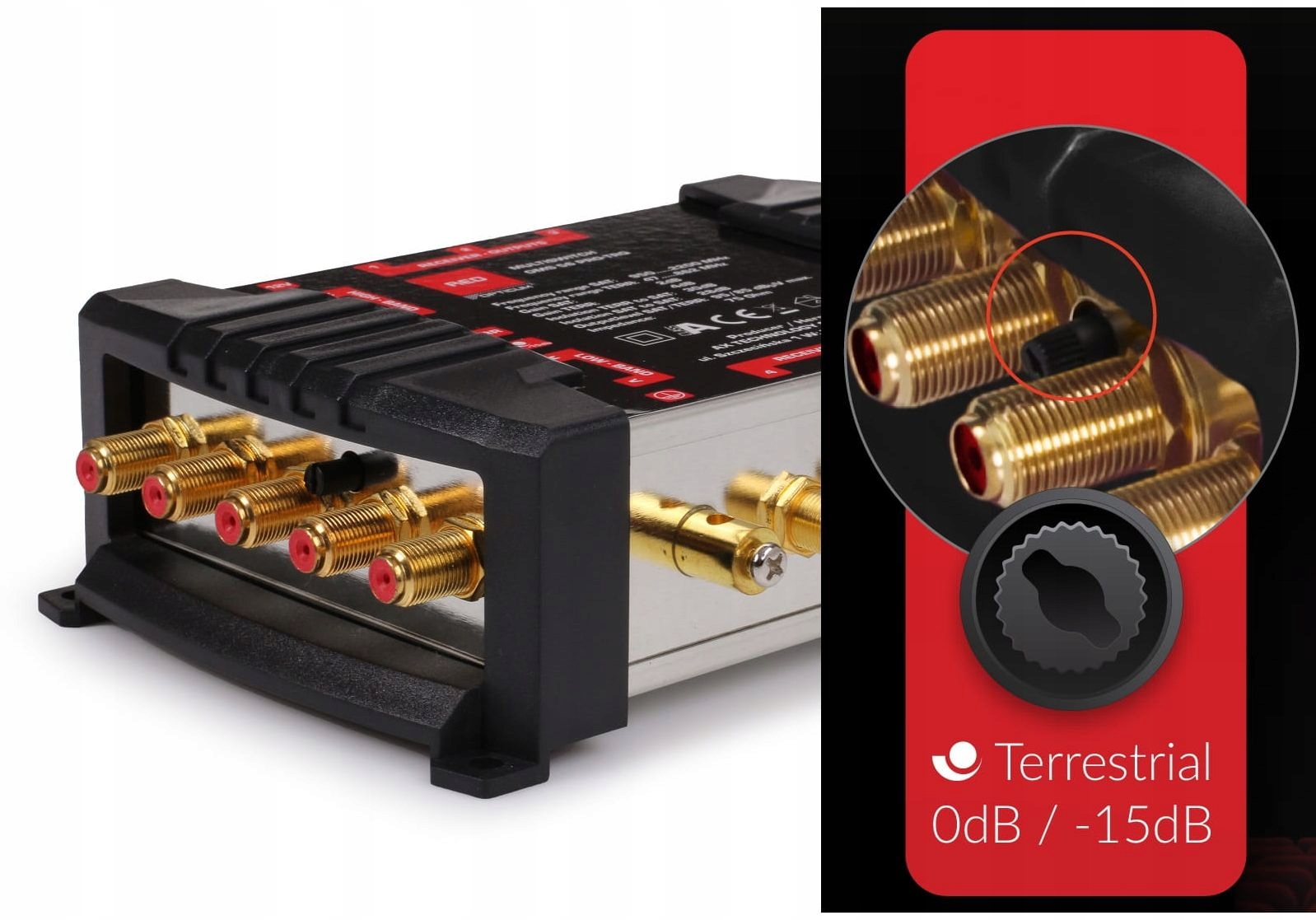 Позолочені розетки значно зменшують втрати сигналу при з'єднанні кабелю антени та не окислюються. Мультисвіч живиться від зовнішнього джерела живлення, що усуває явище підвищеної робочої температури, яка є частою причиною пошкодження пристрою.